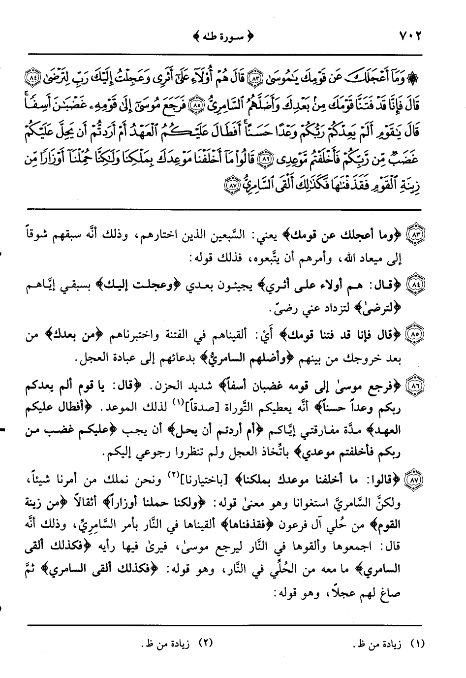 {قال} له موسى صلوات الله عليه: {فاذهب فإنَّ لك في الحياة} يعني: ما دمت حيَّاً {أَنْ تَقُولَ لا مِسَاسَ} لا تخالط أحداً ولا يخالطك وأمر موسى بني إسرائيل ألا يخالطوه وصار السَّامريُّ بحيث لو مسَّه أحدٌ أو مسَّ هو أحداً حُمَّ كلاهما {وإن لك موعداً} لعذابك {لن تخلفه} لن يُخلفكه الله {وانظر إلى إلهك} معبودك {الذي ظلت عليه عاكفاً} دمتَ عليه مقيماً تعبده {لنحرقنَّه} بالنَّار {ثمَّ لننسفنَّه} لنذرينَّه في البحر