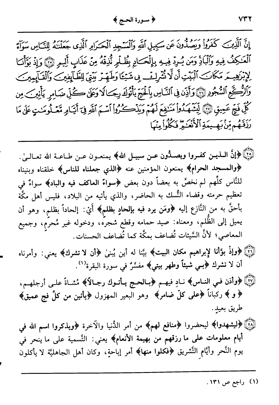 {والبدن} الإبل والبقر {جعلناها لكم من شعائر الله} أعلام دينه {لكم فيها خيرٌ} النَّفع في الدُّنيا والأجر في العقبى {فاذكروا اسم الله} وهو أن يقول عند نحرها: اللَّهُ أَكْبَرُ لا إِلَهَ إِلا اللَّهُ وَاللَّهُ أكبر {صواف} قائمةً معقولة اليد اليسرى {فإذا وجبت جنوبها} سقطت على الأرض {فكلوا منها وأطعموا القانع} الذي يسألك {والمعتر} الذي يتعرَّض لك ولا يسألك {كذلك} الذي وفصفنا {سخرناها لكم} يعني: البدن {لعلَّكم تشكرون} لكي تطيعوني