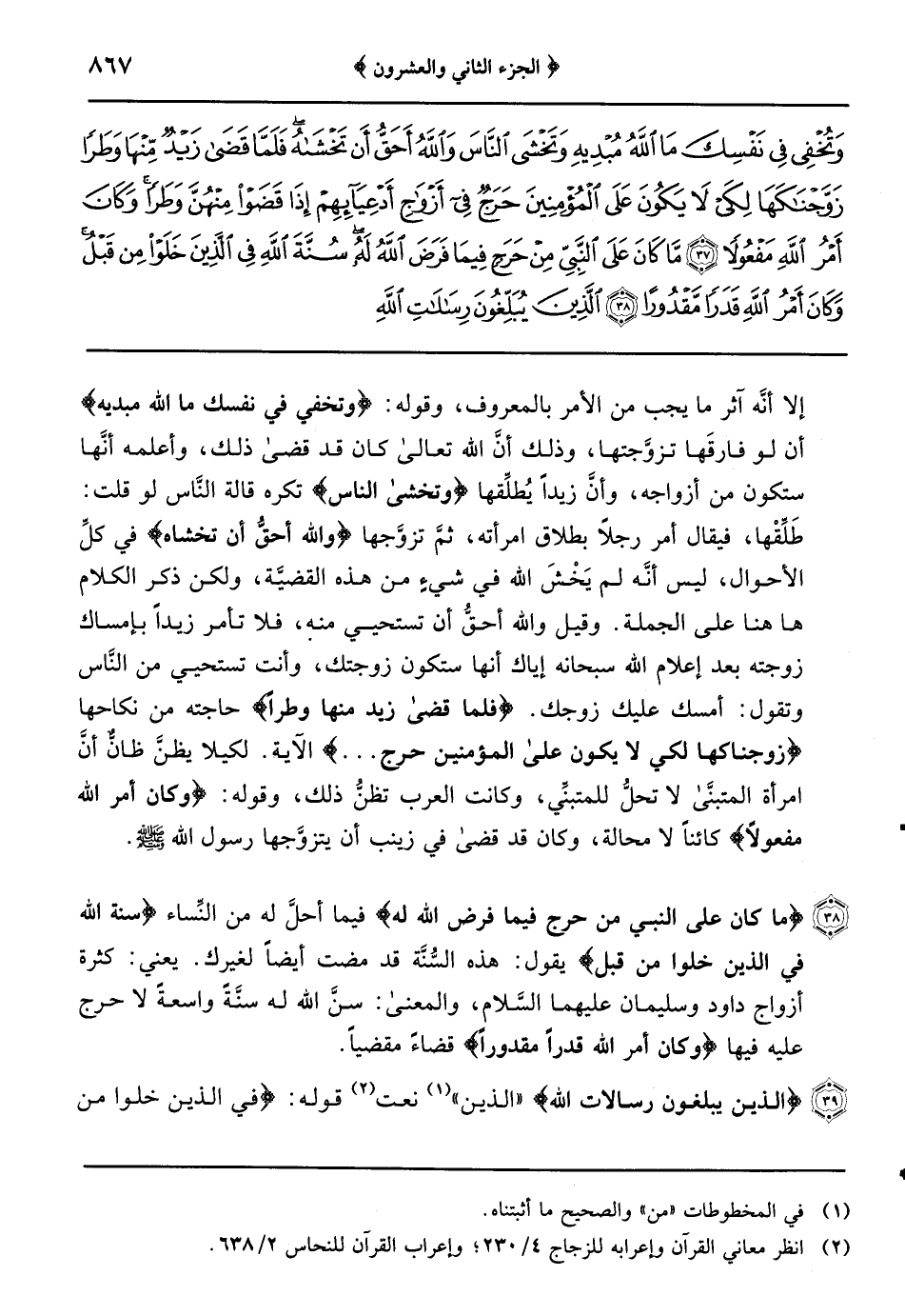 {يا أيها النَّبِيُّ إِنَّا أَحْلَلْنَا لَكَ أَزْوَاجَكَ اللَّاتِي آتَيْتَ أجورهن} مهورهنَّ {وما ملكت يمينك} من الإِماء {ممَّا أفاء الله عليك} جعلهنَّ غنيمة تُسبى وتُسترقُّ بحكم الشَّرع {وبنات عمك وبنات عماتك} أن يتزوجهنَّ يعني: نساء بني عبد المطلب {وبنات خالك وبنات خالاتك} يعني: نساء بني زُهرة {اللَّاتِي هَاجَرْنَ مَعَكَ} فمن لمن يهاجر منهنَّ لم يحلَّ له نكاحها {وامرأة} وأحللنا لك امرأةً {مُؤْمِنَةً إِنْ وَهَبَتْ نَفْسَهَا لِلنَّبِيِّ إِنْ أَرَادَ النبيُّ أن يستنكحها} فله ذلك {خالصة لك من دون المؤمنين} فليس لغير النبي صلى الله عليه وسلم أن يستبيح وطء امرأةٍ بلفظ الهبة من غير ولي ولا مهر ولا شاهدٍ {قَدْ عَلِمْنَا مَا فَرَضْنَا عَلَيْهِمْ فِي أَزْوَاجِهِمْ} وهو أن لا نكاح إلاَّ بوليٍّ وشاهدين {وما ملكت أيمانهم} يريد أنَّه لا يحلُّ لغير النبي صلى الله عليه وسلم إلا أربع ولي وشاهدين وإلا ملك اليمين والنبي صلى الله عليه وسلم يحلُّ له ما ذكر في هذه الآية {لكيلا يكون عليك حرج} في النِّكاح