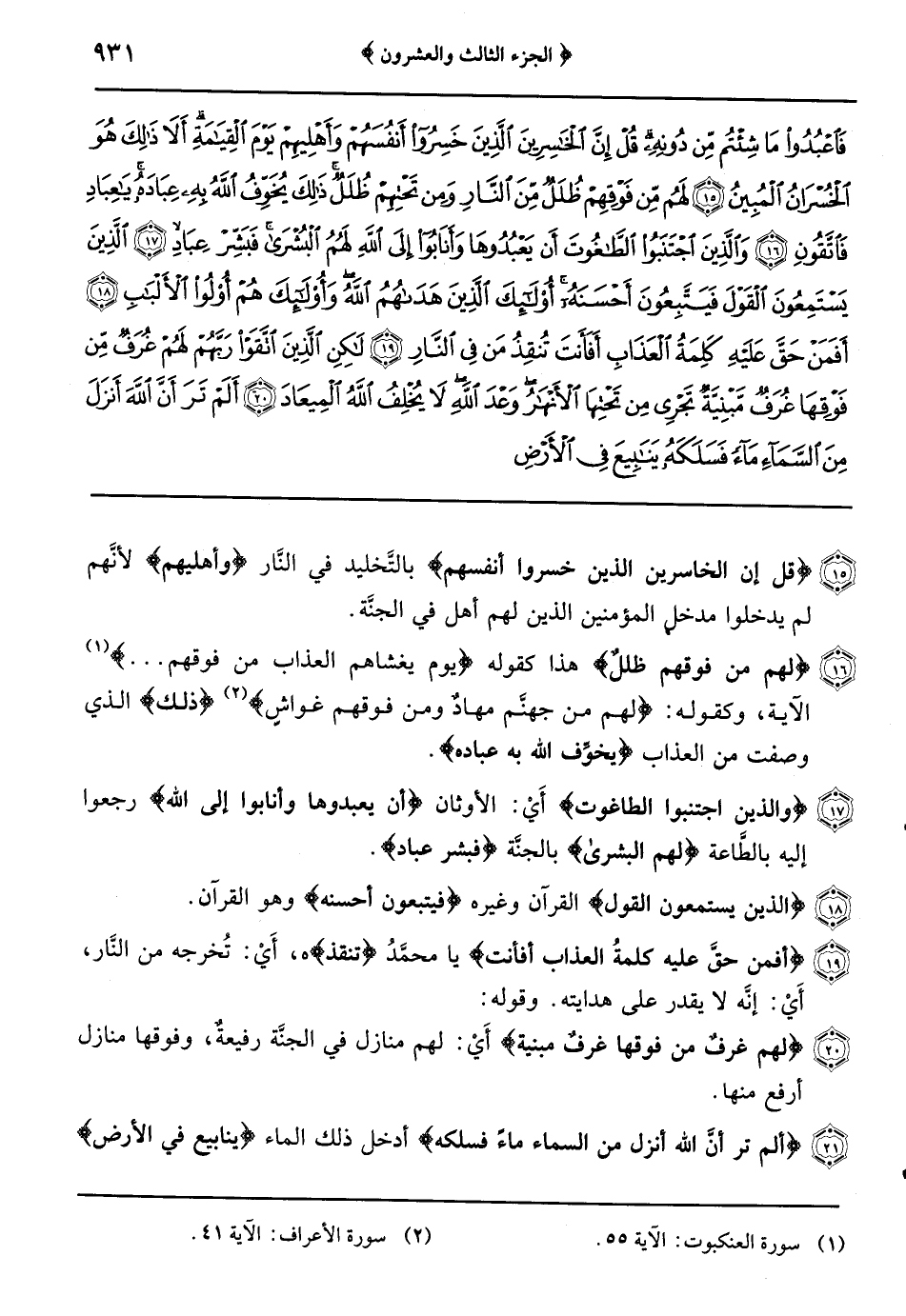 {ضَرَبَ اللَّهُ مَثَلا رَجُلا فِيهِ شُرَكَاءُ مُتَشَاكِسُونَ} متنازعون سيِّئةٌ أخلاقهم وكلُّ واحدٍ يستخدمه بقدر نصيبه وهذا مَثَلُ المشرك الذي يعبد آلهة شتى {ورجلا سلما} خالصاً لرجل وهو الذي يعيد اله وحده {هل يستويان مثلاً} أَيْ: هل يستوي مَثَل الموحِّد ومَثَل المشرك؟ {الحمد لله} وحده دون غيره من المعبودين {بل أكثرهم لا يعلمون} مفسَّر في سورة النَّحل ثمَّ ذكر أنهم يموتون ويرجعون إلى الله فيختصمون عنده فقال: