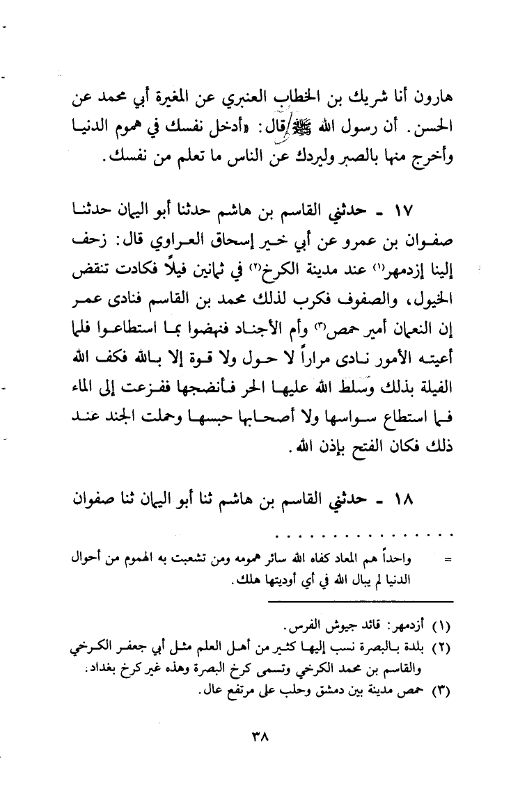 17 - حَدَّثَنِي الْقَاسِمُ بْنُ هَاشِمٍ، نا أَبُو الْيَمَانِ، ثنا صَفْوَانُ بْنُ عَمْرٍو، عَنْ أَبِي يَحْيَى، عَنْ إِسْحَاقَ الْغَزَوَانِيِّ، قَالَ: زَحَفَ إِلَيْنَا أَزْدَمْهَرُ عِنْدَ مَدِينَةِ الْكِيرَجِ فِي ثَمَانِينَ فِيلًا، فَكَادَتْ تَنْفَضُّ الْخُيُولُ وَالصُّفُوفُ، فَكَرِبَ لِذَلِكَ مُحَمَّدُ بْنُ الْقَاسِمِ، فَنَادَى عِمْرَانَ بْنَ النُّعْمَانِ أَمِيرَ أَهْلِ حِمْصٍ وَأُمَرَاءَ الْأَجْنَادِ، فَنَهَضُوا فَمَا اسْتَطَاعُوا، §فَلَمَّا أَعْيَتْهُ الْأُمُورُ نَادَى مِرَارًا: لَا حَوْلَ وَلَا قُوَّةَ إِلَّا بِاللَّهِ، فَكَفَّ اللَّهُ عَزَّ وَجَلَّ الْفِيَلَةَ بِذَلِكَ، وَسَلَّطَ عَلَيْهَا الْحَرَّ، فَأَنْضَجَهَا، فَفَزِعَتْ إِلَى الْمَاءِ، فَمَا اسْتَطَاعَ سُوَّاسُهَا وَلَا أَصْحَابُهَا حَبْسَهَا، وَحَمَلَتِ الْخَيْلُ عِنْدَ ذَلِكَ، فَكَانَ الْفَتْحُ بِإِذْنِ اللَّهِ