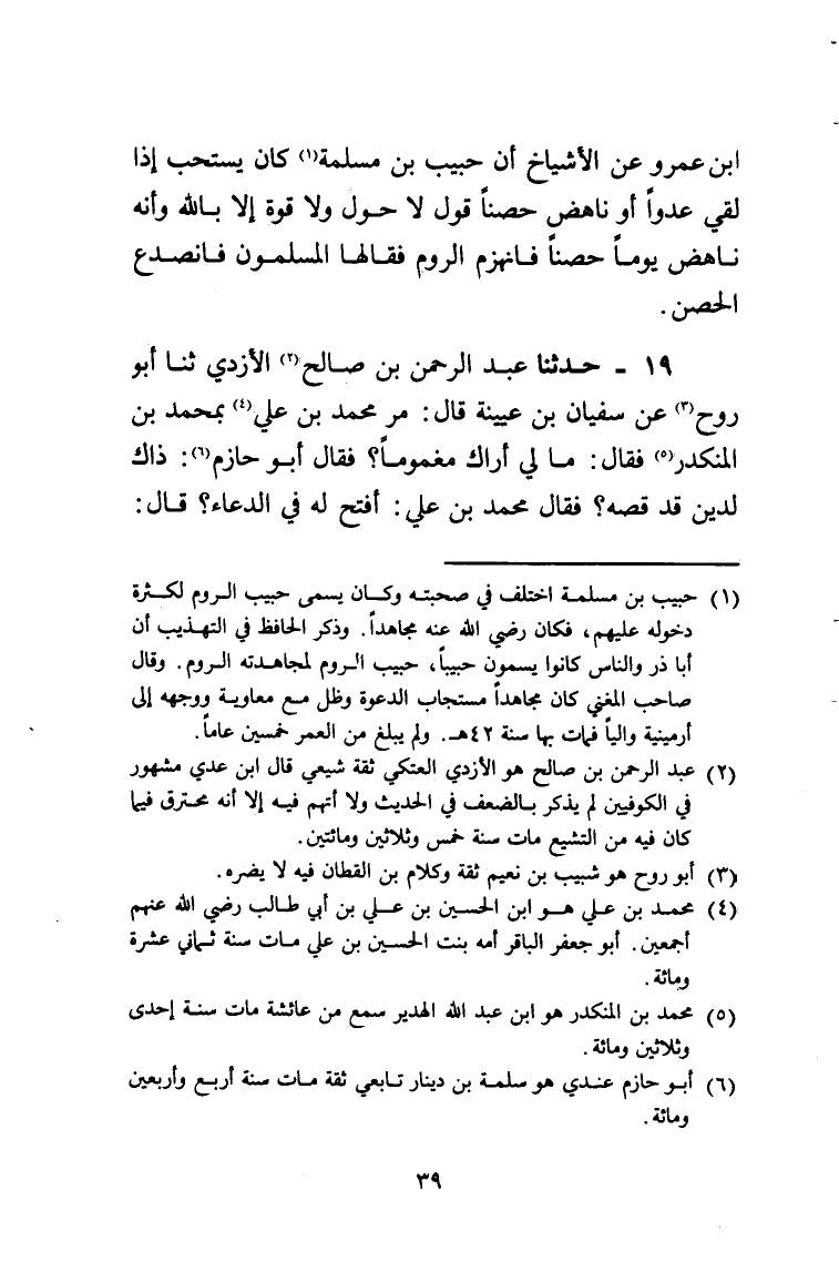 19 - حَدَّثَنَا عَبْدُ الرَّحْمنِ بْنُ صَالِحٍ الْأَزْدِيُّ، حَدَّثَنَا أَبُو رَوْحٍ، رَجُلٌ مِنْ أَهْلِ مَرْوَ عَنْ سُفْيَانَ بْنِ عُيَيْنَةَ، قَالَ: مَرَّ مُحَمَّدُ بْنُ عَلِيٍّ بِمُحَمَّدِ بْنِ الْمُنْكَدِرِ، فَقَالَ: مَا لِي أَرَاكَ مَغْمُومًا؟ فَقَالَ أَبُو حَازِمٍ: ذَاكَ لِدَيْنٍ قَدْ فَدَحَهُ، قَالَ مُحَمَّدُ بْنُ عَلِيٍّ: افْتَحْ لَهُ فِي الدُّعَاءِ، قَالَ: -[40]- نَعَمْ، فَقَالَ: §لَقَدْ بُورِكَ لِعَبْدٍ فِي حَاجَةٍ أَكْثَرَ فِيهَا دُعَاءَ رَبِّهِ كَائِنَةً مَا كَانَتْ