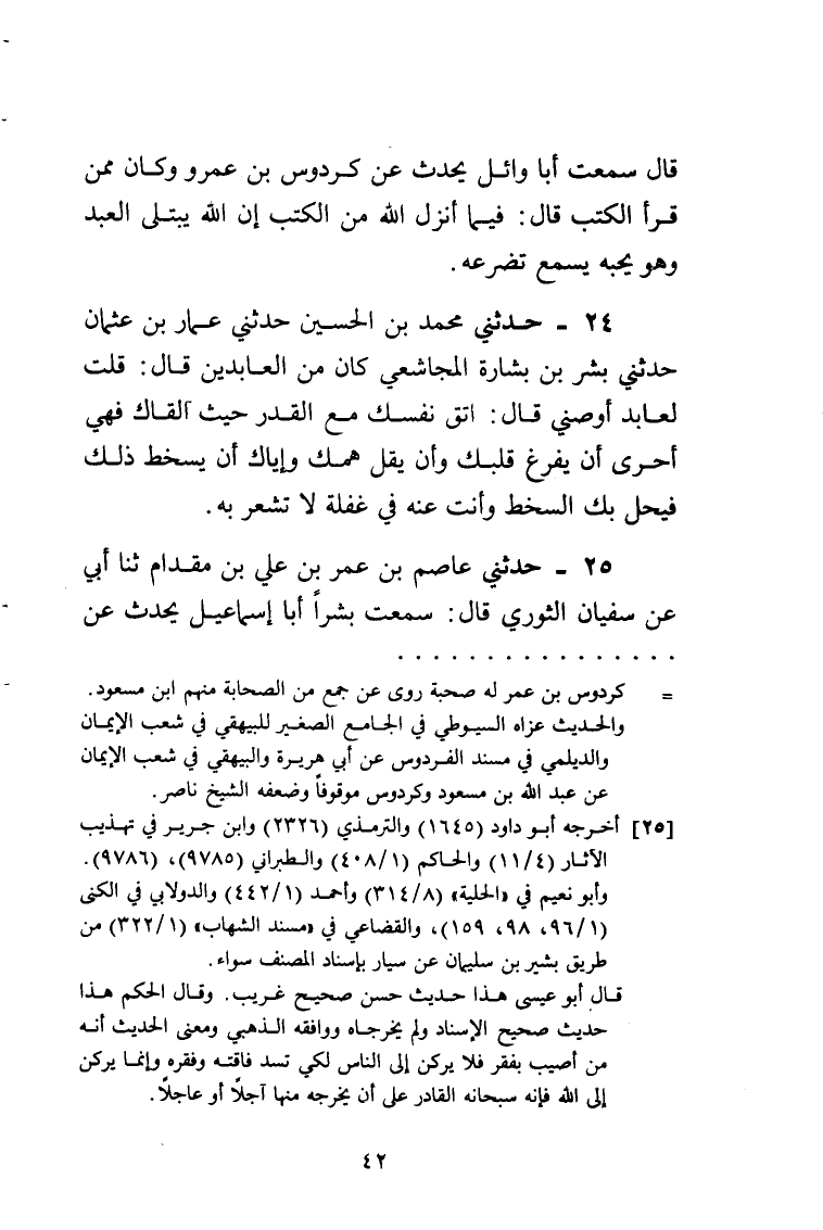 25 - حَدَّثَنِي عَاصِمُ بْنُ عُمَرَ بْنِ عَلِيِّ بْنِ مُقَدَّمٍ، ثنا أَبِي، عَنْ سُفْيَانَ الثَّوْرِيِّ، قَالَ: سَمِعْتُ بَشِيرًا أَبَا إِسْمَاعِيلَ، يُحَدِّثُ عَنْ -[43]- سَيَّارٍ أَبِي حَمْزَةَ، عَنْ طَارِقِ بْنِ شِهَابٍ، عَنْ عَبْدِ اللَّهِ بْنِ مَسْعُودٍ، قَالَ: قَالَ رَسُولُ اللَّهِ صَلَّى اللهُ عَلَيْهِ وَسَلَّمَ: «§مَنْ نَزَلَتْ بِهِ حَاجَةٌ فَأَنْزَلَهَا بِالنَّاسِ لَمْ تُسَدَّ فَاقَتُهُ، فَإِنْ أَنْزَلَهَا بِاللَّهِ أَوْشَكَ اللَّهُ لَهُ بِأَجَلٍ حَاضِرٍ أَوْ رِزْقٍ عَاجِلٍ»