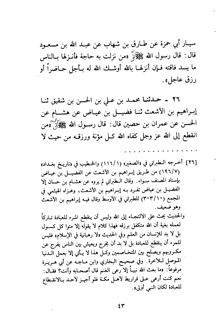26 - حَدَّثَنَا مُحَمَّدُ بْنُ عَلِيِّ بْنِ الْحَسَنِ بْنِ شَقِيقٍ، ثنا إِبْرَاهِيمُ بْنُ الْأَشْعَثَ، ثنا فُضَيْلُ بْنُ عِيَاضٍ، عَنْ هِشَامٍ، عَنِ الْحَسَنِ، عَنْ عِمْرَانَ بْنِ الْحُصَيْنِ، قَالَ: قَالَ رَسُولُ اللَّهِ صَلَّى اللهُ عَلَيْهِ وَسَلَّمَ: «§مَنِ انْقَطَعَ إِلَى اللَّهِ عَزَّ وَجَلَّ كَفَاهُ اللَّهُ كُلَّ مُؤُونَةٍ، وَرَزَقَهُ مِنْ حَيْثُ لَا -[44]- يَحْتَسِبُ، وَمَنِ انْقَطَعَ إِلَى الدُّنْيَا وَكَّلَهُ اللَّهُ إِلَيْهَا»