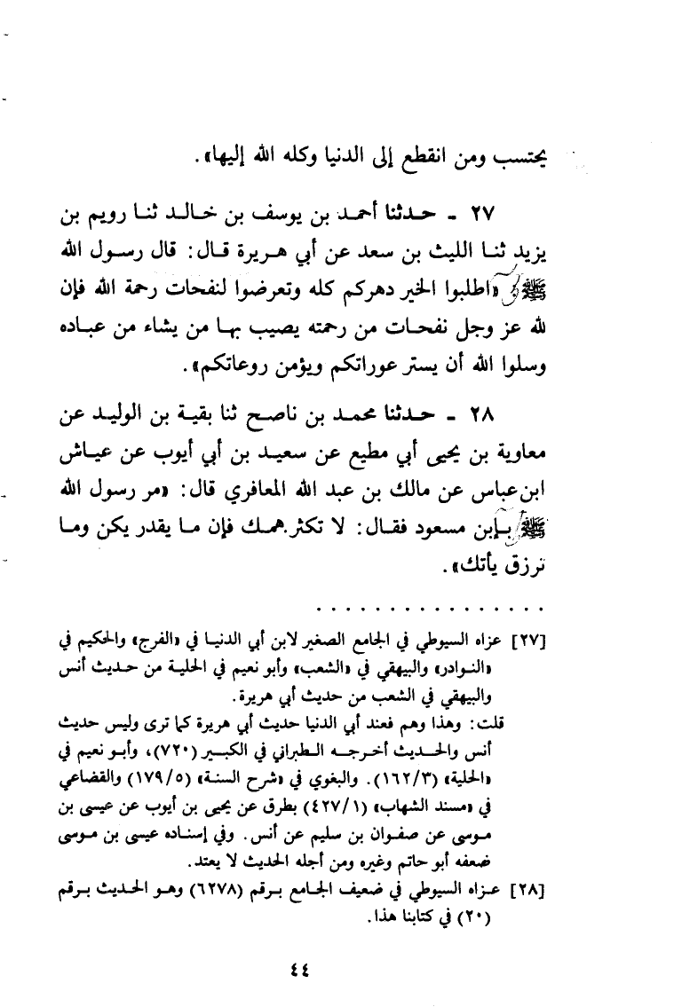 28 - حَدَّثَنَا مُحَمَّدُ بْنُ نَاصِحٍ، ثنا بَقِيَّةُ بْنُ الْوَلِيدِ، عَنْ مُعَاوِيَةَ بْنِ يَحْيَى أَبِي مُطِيعٍ، عَنْ سَعِيدِ بْنِ أَبِي أَيُّوبَ، عَنْ عَيَّاشِ بْنِ عَبَّاسٍ، عَنْ مَالِكِ بْنِ عَبْدِ اللَّهِ الْمَعَافِرِيِّ، قَالَ: مَرَّ رَسُولُ اللَّهِ صَلَّى اللهُ عَلَيْهِ وَسَلَّمَ بِابْنِ مَسْعُودٍ، فَقَالَ: «§لَا تُكْثِرْ هَمَّكَ، فَإِنَّهُ مَا يُقَدَّرْ يَكُنْ، وَمَا تُرْزَقْ يَأْتِكَ»