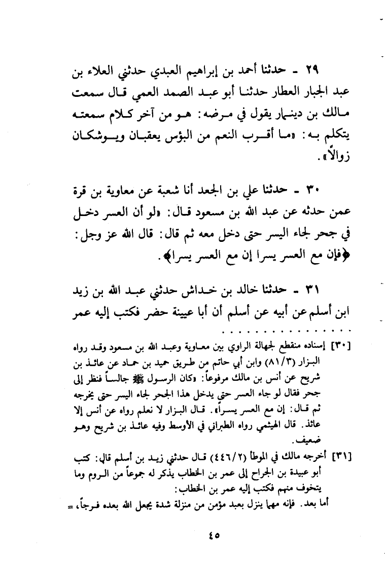 31 - حَدَّثَنَا خَالِدُ بْنُ خِدَاشٍ، قَالَ: حَدَّثَنِي عَبْدُ اللَّهِ بْنُ زَيْدِ بْنِ أَسْلَمَ، عَنْ أَبِيهِ، عَنْ أَسْلَمَ، أَنَّ أَبَا عُبَيْدَةَ حُصِرَ بِالشَّامِ، وَنَالَ مِنْهُ الْعَدُوُّ، فَكَتَبَ إِلَيْهِ عُمَرُ -[46]- بْنُ الْخَطَّابِ رَضِيَ اللَّهُ عَنْهُ يَقُولُ: " §مَهْمَا يَنْزِلْ بِأَمْرِكَ شِدَّةٌ يَجْعَلِ اللَّهُ لَهُ بَعْدَهَا فَرَجًا، وَإِنَّهُ لَنْ يَغْلِبَ عُسْرٌ يُسْرَيْنِ، وَإِنَّهُ يَقُولُ: {اصْبِرُوا وَصَابِرُوا وَرَابِطُوا وَاتَّقُوا اللَّهَ لَعَلَّكُمْ تُفْلِحُونَ} [آل عمران: 200] "