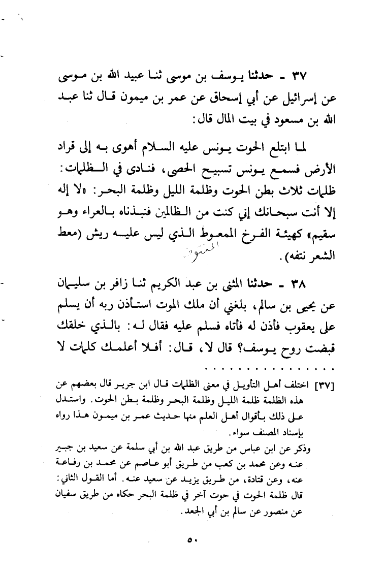 37 - حَدَّثَنَا يُوسُفُ بْنُ مُوسَى، ثنا عُبَيْدُ اللَّهِ بْنُ مُوسَى، عَنْ إِسْرَائِيلَ، عَنْ أَبِي إِسْحَاقَ، عَنْ عَمْرِو بْنِ مَيْمُونٍ، قَالَ: ثنا عَبْدُ اللَّهِ بْنُ مَسْعُودٍ، فِي بَيْتِ الْمَالِ، قَالَ: §لَمَّا ابْتَلَعَ الْحُوتُ يُونُسَ عَلَيْهِ السَّلَامُ، أَهْوَى بِهِ إِلَى قَرَارِ الْأَرْضِ، فَسَمِعَ يُونُسُ عَلَيْهِ السَّلَامُ تَسْبِيحَ الْحَصَى، فَنَادَى فِي الظُّلُمَاتِ؛ ظُلُمَاتٍ ثَلَاثٍ: بَطْنِ الْحُوتِ، وَظُلْمَةِ اللَّيْلِ، وَظُلْمَةِ الْبَحْرِ: {أَنْ لَا إِلَهَ إِلَّا أَنْتَ سُبْحَانَكَ إِنِّي كُنْتُ مِنَ الظَّالِمِينَ} [الأنبياء: 87] ، {فَنَبَذْنَاهُ بِالْعَرَاءِ وَهُوَ سَقِيمٌ} [الصافات: 145] قَالَ: كَهَيْئَةِ الْفَرْخِ الْمَمْعُوطِ الَّذِي لَيْسَ عَلَيْهِ رِيشٌ