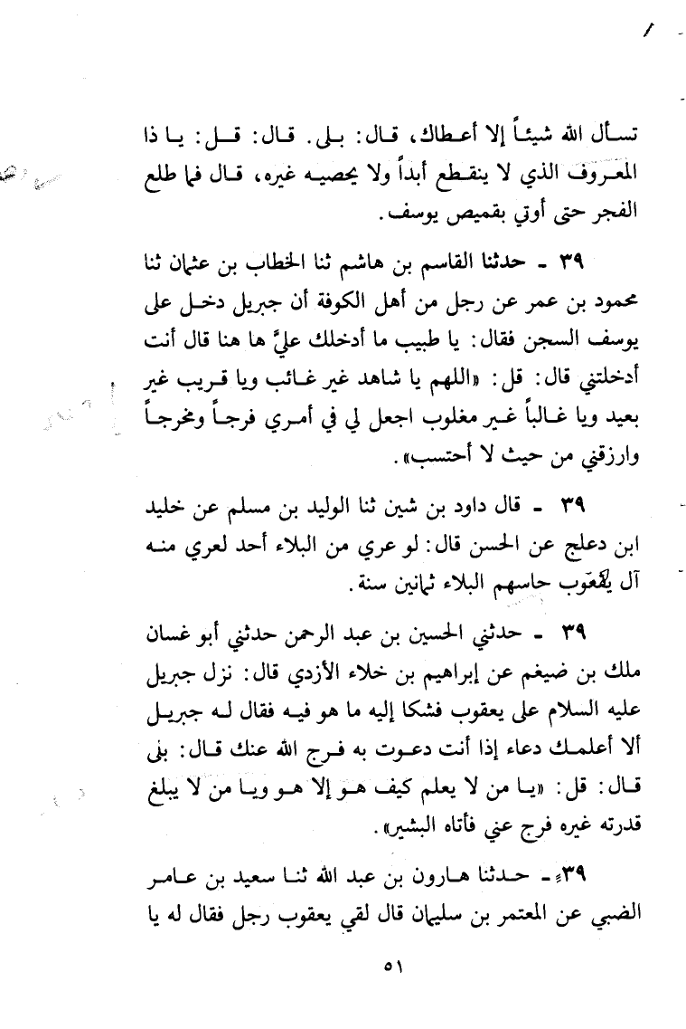 39 - حَدَّثَنَا الْقَاسِمُ بْنُ هَاشِمٍ، نا الْخَطَّابُ بْنُ عُثْمَانَ، ثنا مُحَمَّدُ بْنُ عُمَرَ، عَنْ رَجُلٍ مِنْ أَهْلِ الْكُوفَةِ " أَنَّ جِبْرِيلَ، عَلَيْهِ السَّلَامُ دَخَلَ عَلَى يُوسُفَ السِّجْنَ فَقَالَ: يَا طَيِّبُ مَنْ أَدْخَلَكَ عَلَيَّ هَاهُنَا؟ قَالَ: أَنْتَ أَدْخَلَتَنِي، قَالَ: قُلِ: §اللَّهُمَّ يَا شَاهِدًا غَيْرَ غَائِبٍ، وَيَا قَرِيبًا غَيْرَ بَعِيدٍ، وَيَا غَالِبًا غَيْرَ مَغْلُوبٍ، اجْعَلْ لِي مِنْ أَمْرِي فَرَجًا وَمَخْرَجًا، وَارْزُقْنِي مِنْ حَيْثُ لَا أَحْتَسِبُ "
