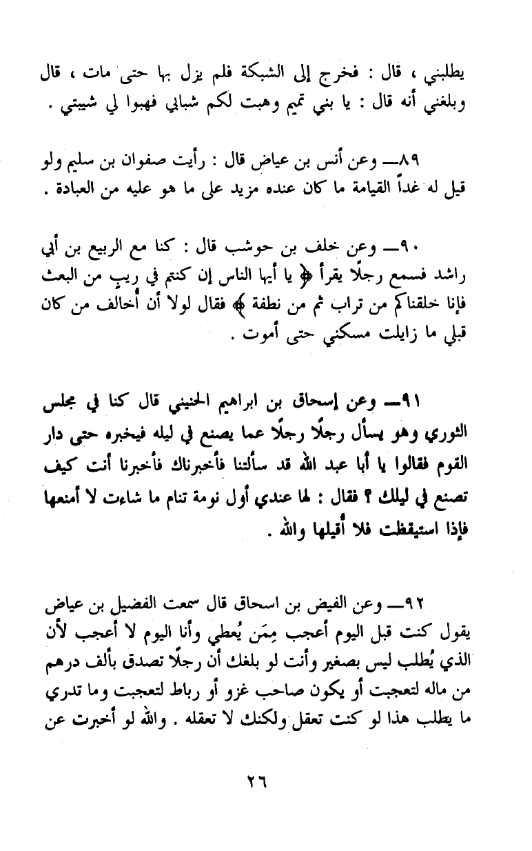 91 - (7/ 60) عَنْ إِسْحَاق بْنَ إِبْرَاهِيمَ الْحُنَيْنِيَّ، يَقُولُ: " كُنَّا فِي مَجْلِسِ الثَّوْرِيِّ وَهُوَ يَسْأَلُ رَجُلًا رَجُلًا عَمَّا يَصْنَعُ فِي لَيْلِهِ فَيخْبِرُهُ، حَتَّى دَارَ الْقَوْمُ فَقَالُوا: يَا أَبَا عَبْدِ اللهِ، قَدْ سَأَلْتَنَا فَأَخْبَرْنَاكَ، فَأَخْبِرْنَا أَنْتَ كَيْفَ تَصْنَعُ فِي لَيْلِكَ؟ فَقَالَ: «لَهَا عِنْدِي أَوَّلُ نَوْمَةٍ، تَنَامُ مَا شَاءَتْ، لَا أَمْنَعُهَا، فَإِذَا اسْتَيْقَظْتُ، فَلَا أُقِيلُهَا وَاللهِ».