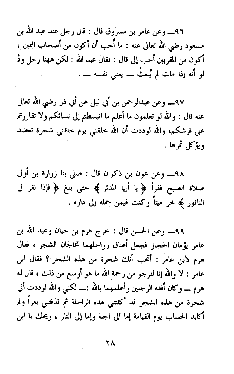 99 - (2/ 120) عَنْ الْحَسَنِ، قَالَ: خَرَجَ هَرِمُ بْنُ حَيَّانَ، وَعَبْدُ اللهِ بْنُ عَامِرٍ يَؤُمَّانِ الْحِجَازَ فَجَعَلَ أَعْنَاقَ رَوَاحِلِهِمَا تُخَالِجَانِ الشَّجَرَ فَقَالَ هَرِمٌ لِابْنِ عَامِرٍ: «أَتُحِبُّ أَنَّكَ شَجَرَةٌ مِنْ هَذِهِ الشَّجَرِ» فَقَالَ: ابْنُ عَامِرٍ: لَا وَاللهِ إِنَّا لَنَرْجُو مِنْ رَحْمَةِ اللهِ مَا هُوَ أَوْسَعُ مِنْ ذَلِكَ قَالَ لَهُ هَرِمٌ وَكَانَ أَفْقَهَ الرَّجُلَيْنِ وَأَعْلَمَهُمَا بِاللهِ: «لَكِنِّي وَاللهِ لَوَدِدْتُ أَنِّي شَجَرَةٌ مِنْ هَذِهِ الشَّجَرِ قَدْ أَكَلَتْنِي هَذِهِ الرَّاحِلَةُ ثُمَّ قَذَفَتْنِي بَعْرًا وَلَمْ أُكَابِدِ الْحِسَابَ يَوْمَ الْقِيَامَةِ إِمَّا إِلَى الْجَنَّةِ وَإِمَّا إِلَى النَّارِ وَيْحَكَ يَا ابْنَ عَامِرٍ إِنِّي أَخَافُ الدَّاهِيَةَ الْكُبْرَى»