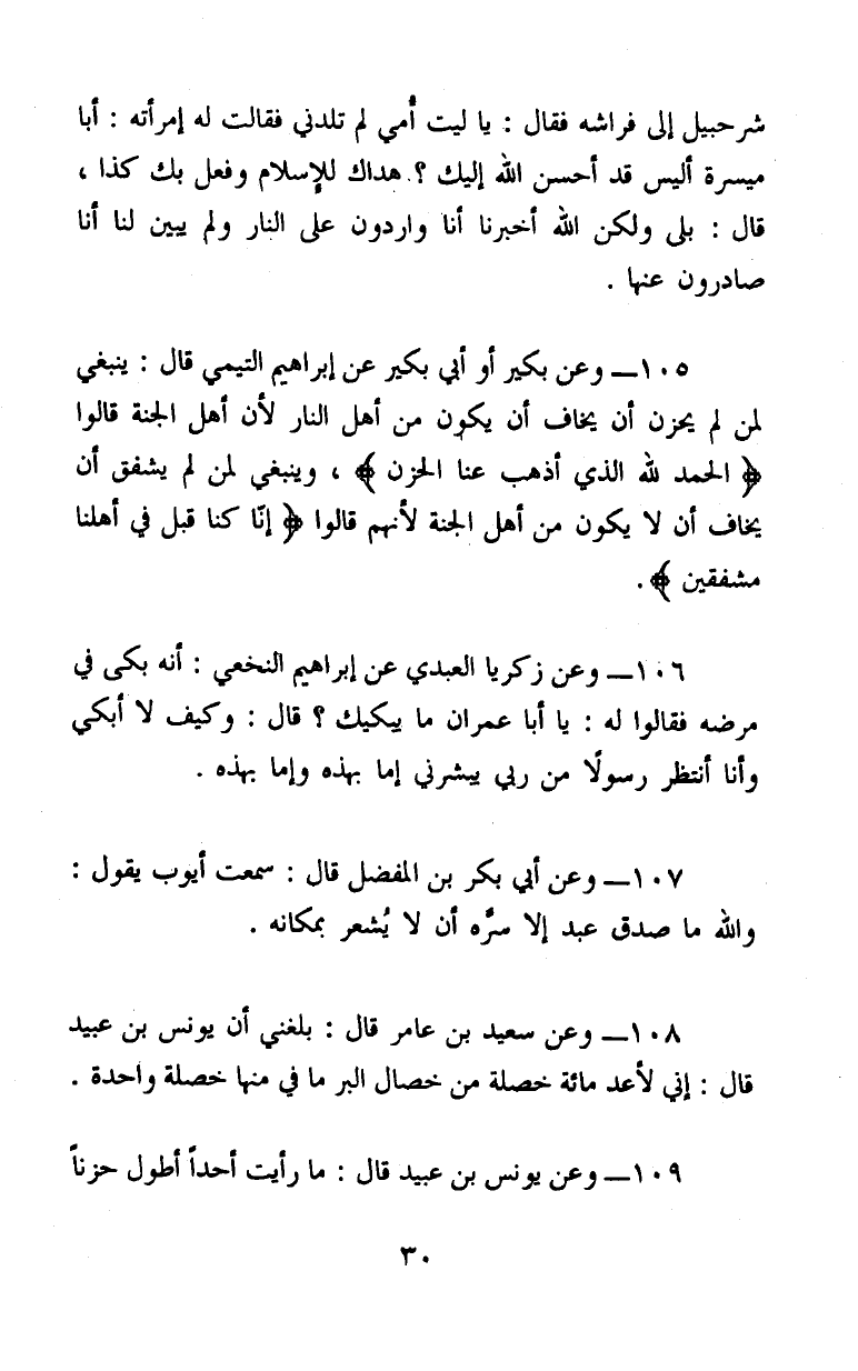 106 - (4/ 224) عَنْ إِبْرَاهِيم النَّخَعِيِّ: أَنَّهُ بَكَى فِي مَرَضِهِ، فَقَالُوا لَهُ: يَا أَبَا عِمْرَانَ، مَا يُبْكِيكَ؟ قَالَ: «وَكَيْفَ لَا أَبْكِي وَأَنَا أَنْتَظِرُ رَسُولًا مِنْ رَبِّي يُبَشِّرُنِي، إِمَّا بِهَذِهِ، وَإِمَّا بِهَذِهِ»