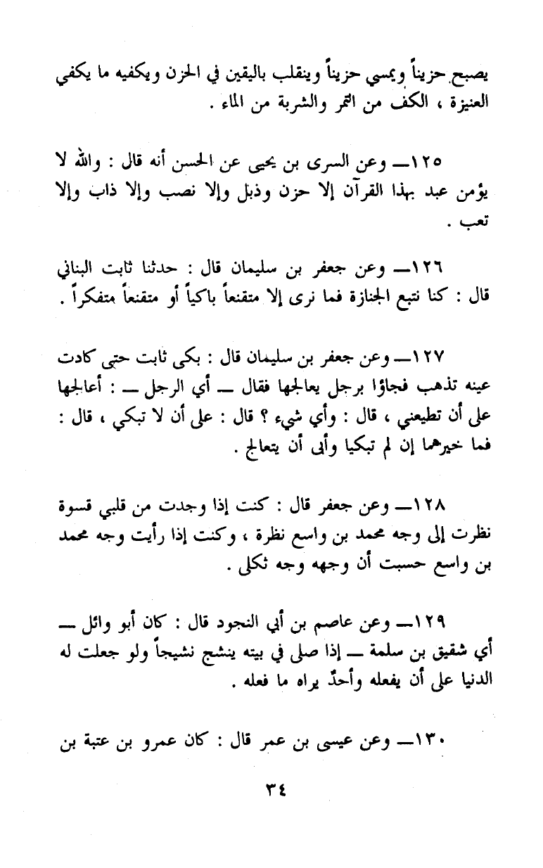 128 - (2/ 347) عَنْ جَعْفَر قَالَ: «كُنْتُ إِذَا وَجَدْتُ مِنْ قَلْبِي قَسْوَةً نَظَرْتُ إِلَى وَجْهِ مُحَمَّدِ بْنِ وَاسِعٍ نَظْرَةً وَكُنْتُ إِذَا رَأَيْتُ وَجْهَ مُحَمَّدِ بْنِ وَاسِعٍ حَسِبْتُ أَنَّ وَجْهَهُ وَجْهَ ثَكْلَى»