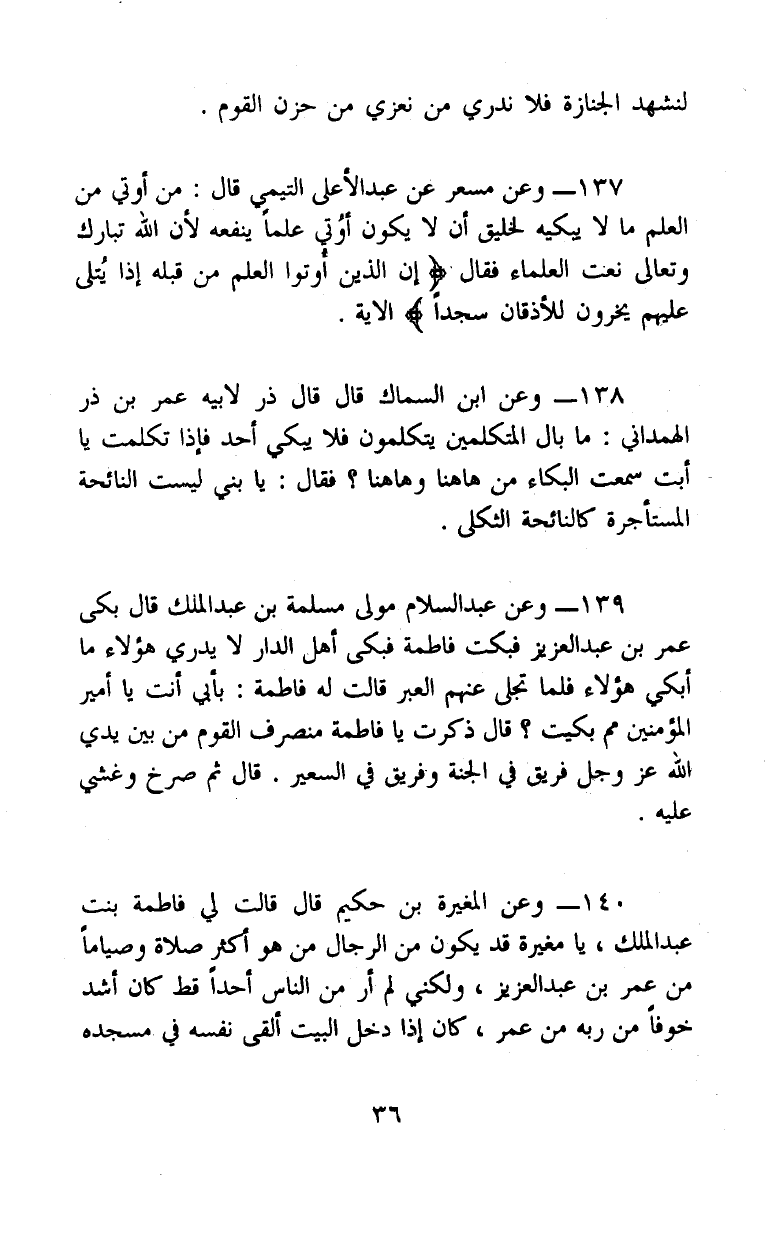 139 - (5/ 269) بَكَى عُمَرُ بْنُ عَبْدِ الْعَزِيزِ فَبَكَتْ فَاطِمَةُ، فَبَكَى أَهْلُ الدَّارِ لَا يَدْرِي هَؤُلَاءِ مَا أَبْكَى هَؤُلَاءِ، فَلَمَّا تَجَلَّى عَنْهُمُ الْعِبَرُ، قَالَتْ لَهُ فَاطِمَةُ: بِأَبِي أَنْتَ يَا أَمِيرَ الْمُؤْمِنِينَ، مِمَّ بَكَيْتَ؟ قَالَ: ذَكَرْتُ يَا فَاطِمَةُ مُنْصَرَفَ الْقَوْمِ مِنْ بَيْنِ يَدَيِ اللهِ عَزَّ وَجَلَّ، فَرِيقٌ فِي الْجَنَّةِ، وَفَرِيقٌ فِي السَّعِيرِ، قَالَ: «ثُمَّ صَرَخَ وَغُشِيَ عَلَيْهِ»