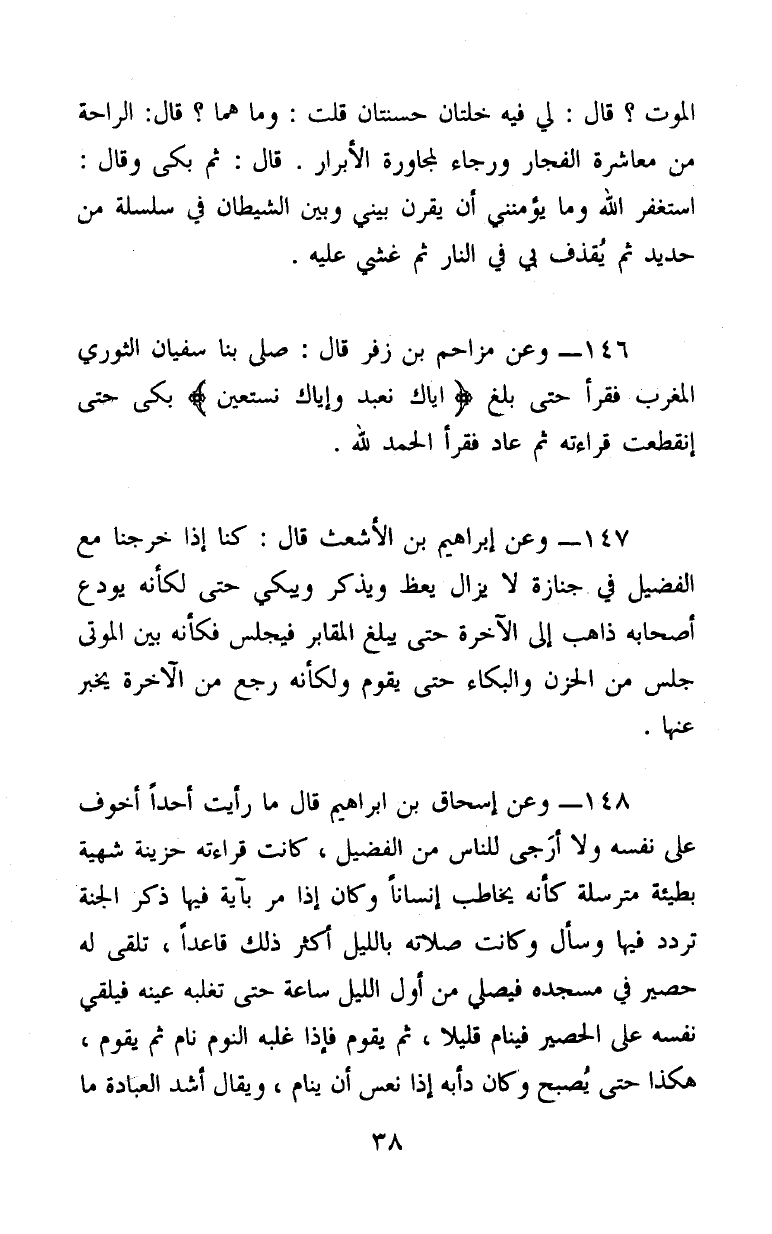 148 - (8/ 86) عَنْ إِسْحَاق بْنُ إِبْرَاهِيمَ، قَالَ: مَا رَأَيْتُ أَحَدًا أَخْوَفَ عَلَى نَفْسِهِ وَلَا أَرْجَى لِلنَّاسِ مِنَ الْفُضَيْلِ كَانَتْ قِرَاءَتُهُ حَزِينَةً شَهِيَّةً بَطِيئَةً مُتَرَسِّلَةً، كَأَنَّهُ يُخَاطِبُ إِنْسَانًا، وَكَانَ إِذَا مَرَّ بِآيَةٍ فِيهَا ذِكْرُ الْجَنَّةِ تَرَدَّدَ فِيهَا وَسَأَلَ، وَكَانَتْ صَلَاتُهُ بِاللَّيْلِ أَكْثَرَ ذَلِكَ قَاعِدًا، تُلْقَى لَهُ حَصِيرٌ فِي مَسْجِدِهِ فَيُصَلِّي مِنْ أَوَّلِ اللَّيْلِ سَاعَةً حَتَّى تَغْلِبَهُ عَيْنُهُ فَيُلْقِي نَفْسَهُ عَلَى الْحَصِيرِ فَيَنَامُ قَلِيلًا ثُمَّ يَقُومُ فَإِذَا غَلَبَهُ النَّوْمُ نَامَ ثُمَّ يَقُومُ هَكَذَا حَتَّى يُصْبِحَ وَكَانَ دَأْبُهُ إِذَا نَعَسَ أَنْ يَنَامَ وَيُقَالُ: أَشَدُّ الْعِبَادَةِ مَا يَكُونُ هَكَذَا