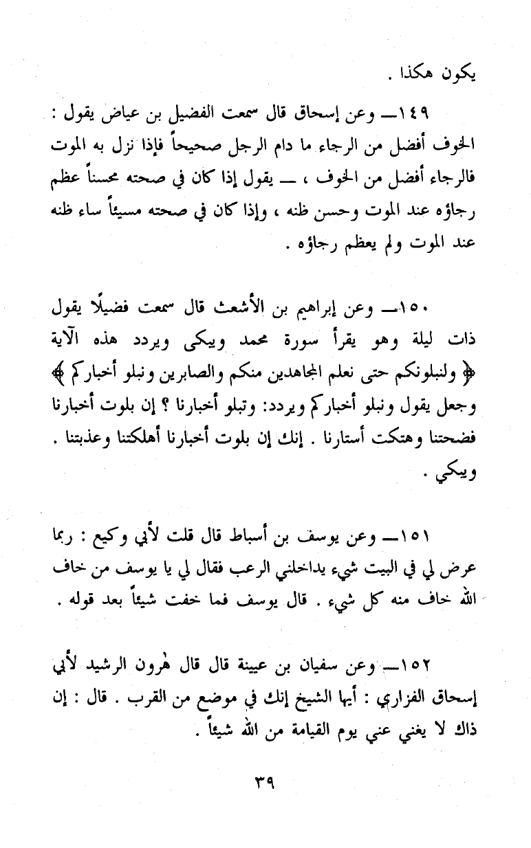 149 - (8/ 89) عَنْ إِسْحَاق، قَالَ: سَمِعْتُ الْفُضَيْلَ، يَقُولُ: " الْخَوْفُ أَفْضَلُ مِنَ الرَّجَاءِ مَادَامَ الرَّجُلُ صَحِيحًا فَإِذَا نَزَلَ بِهِ الْمَوْتُ فَالرَّجَاءُ أَفْضَلُ مِنَ الْخَوْفِ. يَقُولُ: إِذَا كَانَ فِي صِحَّتِهِ مُحْسِنًا عَظُمَ رَجَاؤُهُ عِنْدَ الْمَوْتِ وَحَسُنَ ظَنُّهُ. وَإِذَا كَانَ فِي صِحَّتِهِ مُسِيئًا سَاءَ ظَنُّهُ عِنْدَ الْمَوْتِ وَلَمْ يَعْظُمْ رَجَاؤُهُ "