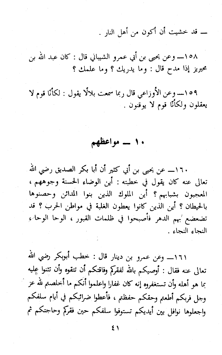 160 - (1/ 34) عَنْ يَحْيَى بْنِ أَبِي كَثِيرٍ، أَنَّ أَبَا بَكْرٍ الصِّدِّيقَ، رَضِيَ اللهُ تَعَالَى عَنْهُ كَانَ يَقُولُ فِي خُطْبَتِهِ: «أَيْنَ الْوُضَّاءُ الْحَسَنَةُ وُجُوهُهُمُ، الْمُعْجَبُونَ بِشَبَابِهِمْ؟ أَيْنَ الْمُلُوكُ الَّذِينَ بَنَوُا الْمَدَائِنَ وَحَصَّنُوهَا بِالْحِيطَانِ؟ أَيْنَ الَّذِينَ كَانُوا يُعْطُونَ الْغَلَبَةَ فِي مَوَاطِنِ الْحَرْبِ؟ قَدْ تَضَعْضَعَ بِهِمُ الدَّهْرُ فَأَصْبَحُوا فِي ظُلُمَاتِ الْقُبُورِ، الْوَحَا الْوَحَا، النَّجَاءُ النَّجَاءُ»