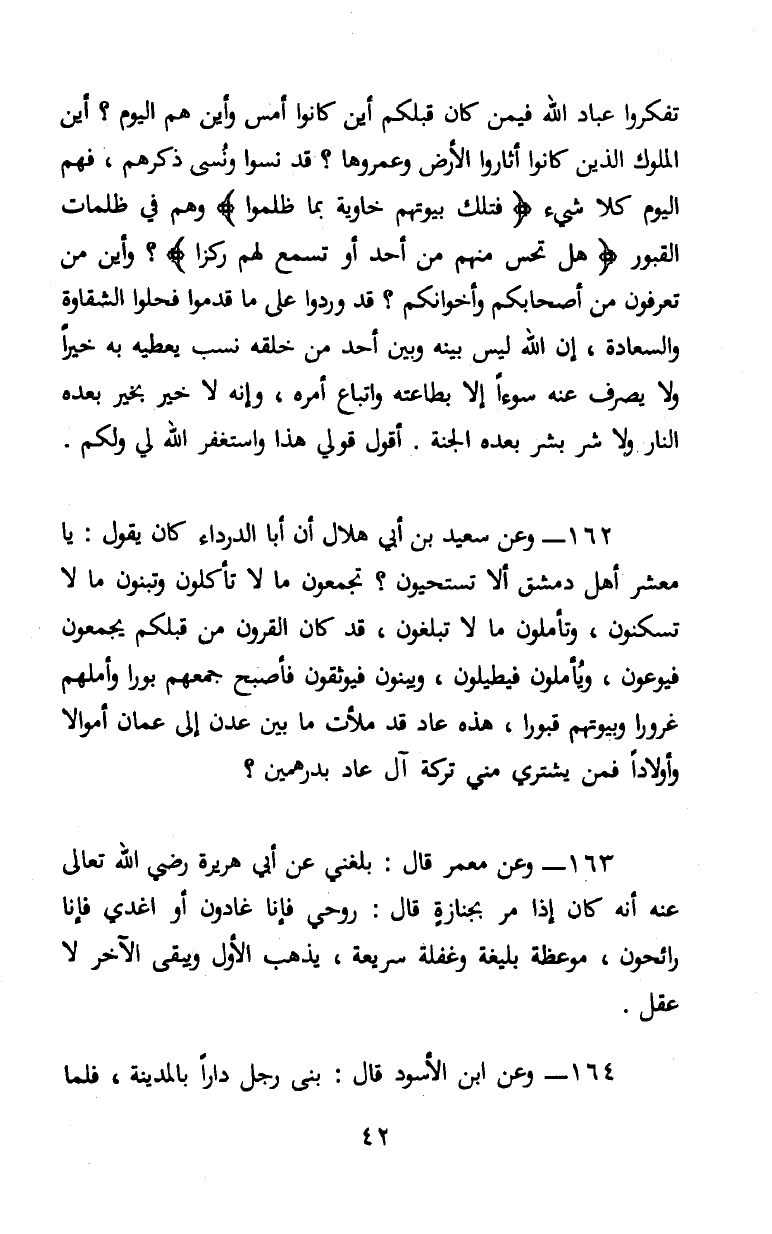 162 - (1/ 217) عَنْ سَعِيدِ بْنِ أَبِي هِلَالٍ، أَنَّ أَبَا الدَّرْدَاءِ، كَانَ يَقُولُ: «يَا مَعْشَرَ أَهْلِ دِمَشْقَ، أَلَا تَسْتَحْيُونَ؟ تَجْمَعُونَ مَا لَا تَأْكُلُونَ، وَتَبْنُونَ مَا لَا تَسْكُنُونَ، وَتَأْمَلُونَ مَا لَا تَبْلُغُونَ، قَدْ كَانَ الْقُرُونُ مِنْ قَبْلِكُمْ يَجْمَعُونَ فَيُوعُونَ، وَيَأْمَلُونَ [ص:218] فَيُطِيلُونَ، وَيَبْنُونَ فَيُوثِقُونَ، فَأَصْبَحَ جَمْعُهُمْ بُورًا، وَأَمَلُهُمْ غُرُورًا، وَبُيُوتُهُمْ قُبُورًا، هَذِهِ عَادٌ قَدْ مَلَأْتَ مَا بَيْنَ عَدَنَ إِلَى عُمَانَ أَمْوَالًا وَأَوْلَادًا، فَمَنْ يَشْتَرِي مِنِّي تَرِكَةَ آلِ عَادٍ بِدِرْهَمَيْنِ؟»