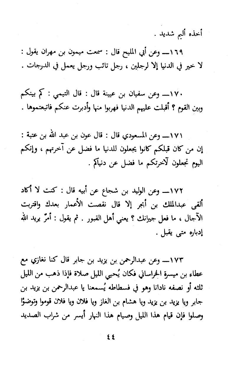 173 - (5/ 193) عَنْ عَبْد الرَّحْمَنِ بْنُ يَزِيدَ بْنِ جَابِرٍ قَالَ: كُنَّا نُغَازِي مَعَ عَطَاءٍ الْخُرَاسَانِيِّ فَكَانَ يُحْيِي اللَّيْلَ صَلَاةً، فَإِذَا ذَهَبَ مِنَ اللَّيْلِ ثُلُثُهُ أَوْ نِصْفُهُ نَادَانَا وَهُوَ فِي فُسْطَاطِهِ يُسْمِعُنَا: يَا عَبْدَ الرَّحْمَنِ بْنَ يَزِيدَ بْنِ جَابِرٍ، وَيَا يَزِيدُ بْنَ يَزِيدَ، وَيَا هِشَامُ بْنَ الْغَازِ، وَيَا فُلَانُ، وَيَا فُلَانُ، قُومُوا وَتَوَضَّئُوا وَصَلُّوا، فَإِنَّ قِيَامَ هَذَا اللَّيْلِ، وَصِيَامَ هَذَا النَّهَارِ، أَيْسَرُ مِنْ شَرَابِ الصَّدِيدِ،