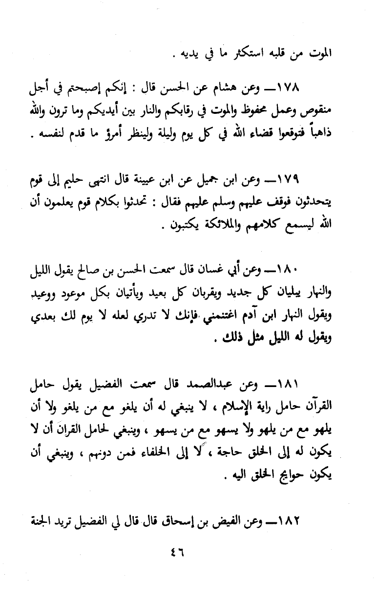 181 - (8/ 92) عَنْ الْفُضَيْل: «حَامِلُ الْقُرْآنِ حَامِلُ رَايَةِ الْإِسْلَامِ لَا يَنْبَغِي لَهُ أَنْ يَلْغُوَ مَعَ مَنْ يَلْغُو وَلَا أَنْ يَلْهُوَ مَعَ مَنْ يَلْهُو وَلَا يَسْهُوُ مَعَ مَنْ يَسْهُو وَيَنْبَغِي لِحَامِلِ الْقُرْآنِ أَنْ لَا يَكُونَ لَهُ إِلَى الْخَلْقِ حَاجَةٌ لَا إِلَى الْخُلَفَاءِ، فَمَنْ دُونَهُمْ وَيَنْبَغِي أَنْ يَكُونَ حَوَايِجُ الْخَلْقِ إِلَيْهِ»
