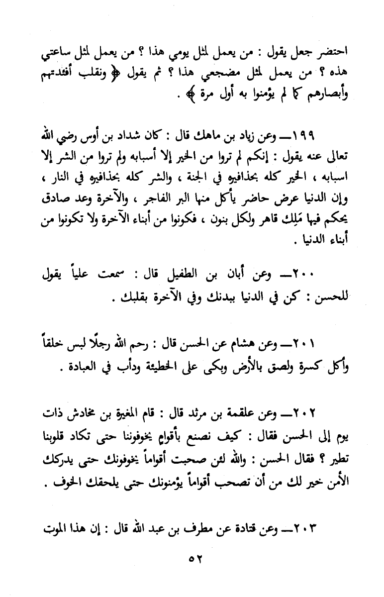 201 - (2/ 149) عَنْ الْحَسَنِ، قَالَ: «رَحِمَ اللهُ رَجُلًا لَبِسَ خَلِقًا وَأَكَلَ كِسْرَةً وَلَصَقَ بِالْأَرْضِ وَبَكَى عَلَى الْخَطِيئَةِ وَدَأَبَ فِي الْعِبَادَةِ»