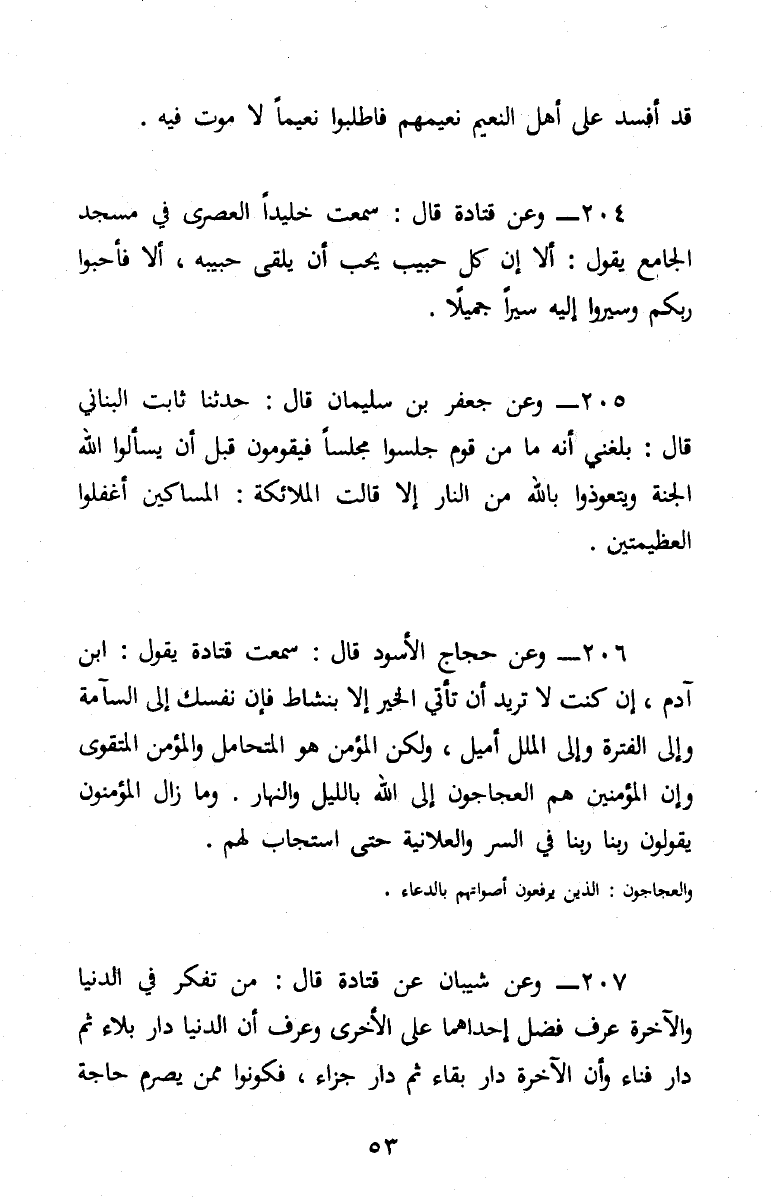 204 - (2/ 232) عَنْ قَتَادَة، قَالَ: سَمِعْتُ خُلَيْدًا الْعَصْرِيَّ، فِي مَسْجِدِ الْجَامِعِ يَقُولُ: «أَلَا إِنَّ كُلَّ حَبِيبٍ يُحِبُّ أَنْ يَلْقَى حَبِيبَهُ أَلَا فَأَحِبُّوا رَبَّكُمْ، وَسِيرُوا إِلَيْهِ سَيْرًا جَمِيلًا»