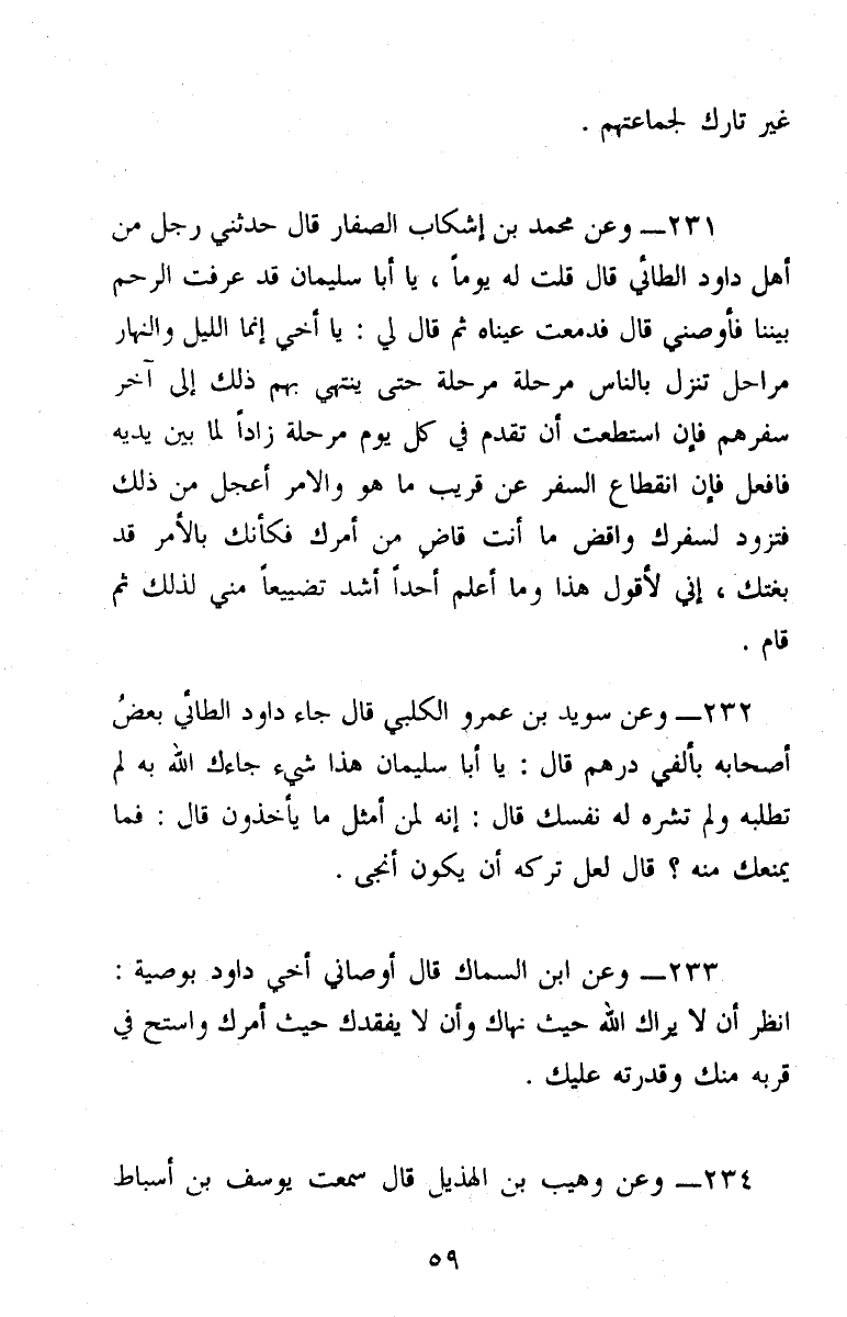 231 - (7/ 345) وعَنْ مُحَمَّد بْنُ إِشْكَابَ الصَّفَّارُ، حَدَّثَنِي رَجُلٌ، مِنْ أَهْلِ دَاوُدَ الطَّائِيِّ قَالَ: قُلْتُ لَهُ يَوْمًا: " يَا أَبَا سُلَيْمَانَ، قَدْ عَرَفْتَ الرَّحِمَ بَيْنَنَا، فَأَوْصِنِي، قَالَ: فَدَمَعَتْ عَيْنَاهُ ثُمَّ قَالَ لِي: يَا أَخِي، إِنَّمَا اللَّيْلُ وَالنَّهَارُ مَرَاحِلُ، تَنْزِلُ بِالنَّاسِ مَرْحَلَةً مَرْحَلَةً حَتَّى تَنْتَهِيَ بِهِمْ ذَلِكَ إِلَى آخِرِ سَفَرِهِمْ، فَإِنِ اسْتَطَعْتَ أَنْ تُقَدِّمَ فِي كُلِّ يَوْمِ مَرْحَلَةٍ زَادًا لِمَا بَيْنَ يَدَيْهِ فَافْعَلْ، فَإِنَّ انْقِطَاعَ السَّفَرِ عَنْ قَرِيبٍ مَا هُوَ وَالْأَمْرُ أَعْجَلُ مِنْ ذَلِكَ، فَتَزَوَّدْ لِسَفَرِكَ، وَاقْضِ مَا أَنْتَ قَاضٍ مِنْ أَمْرِكَ، فَكَأَنَّكَ بِالْأَمْرِ قَدْ بَغَتَكَ، إِنِّي لَأَقُولُ هَذَا، وَمَا أَعْلَمُ أَحَدًا أَشَدَّ تَضْيِيعًا مِنِّي لِذَلِكَ ثُمَّ قَامَ "