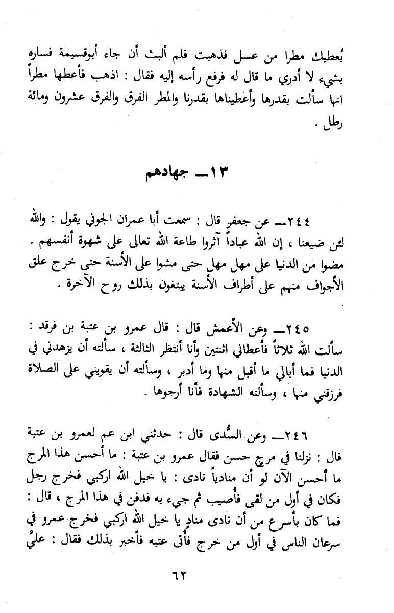 244 - (2/ 310) عَنْ جَعْفَر، قَالَ: سَمِعْتُ أَبَا عِمْرَانَ الْجَوْنِيَّ، يَقُولُ: «وَاللهِ لَئِنْ ضَيَّعْنَا إِنَّ لِلَّهِ عِبَادًا آثَرُوا طَاعَةَ اللهِ تَعَالَى عَلَى شَهْوَةِ أَنْفُسِهِمْ وَمَضَوْا مِنَ الدُّنْيَا عَلَى مَهَلٍ مَهَلٍ حَتَّى مَشَوْا عَلَى الْأَسِنَّةِ حَتَّى خَرَجَ عَلَقُ الْأَجْوَافِ مِنْهُمْ عَلَى أَطْرَافِ الْأَسِنَّةِ يَبْتَغُونَ بِذَلِكَ رَوْحَ الْآخِرَةِ»