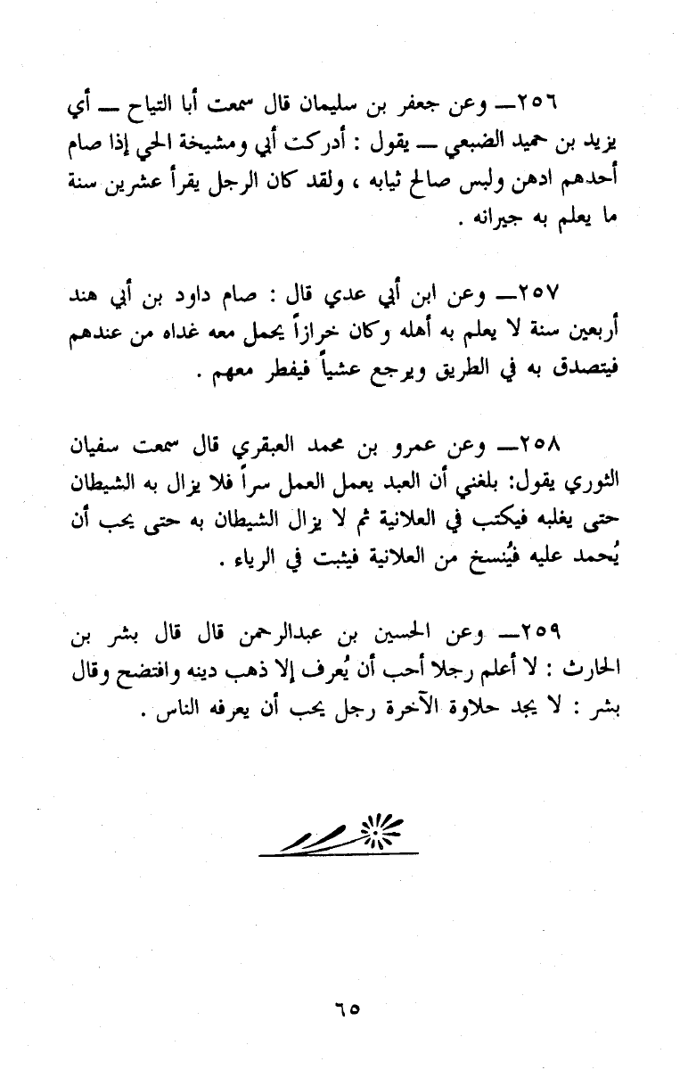 259 - (8/ 343) وعَنْ الْحُسَيْن بْنُ عَبْدِ الرَّحْمَنِ، قَالَ: قَالَ بِشْرُ بْنُ الْحَارِثِ: «لَا أَعْلَمُ رَجُلًا أَحَبَّ أَنْ يَعْرِفَ إِلَّا ذَهَبَ دِينُهُ وَافْتَضَحَ»، وَقَالَ بِشْرٌ: «لَا يَجِدُ حَلَاوَةَ الْآخِرَةِ رَجُلٌ يُحِبُّ أَنْ يَعْرِفَهَ النَّاسُ»