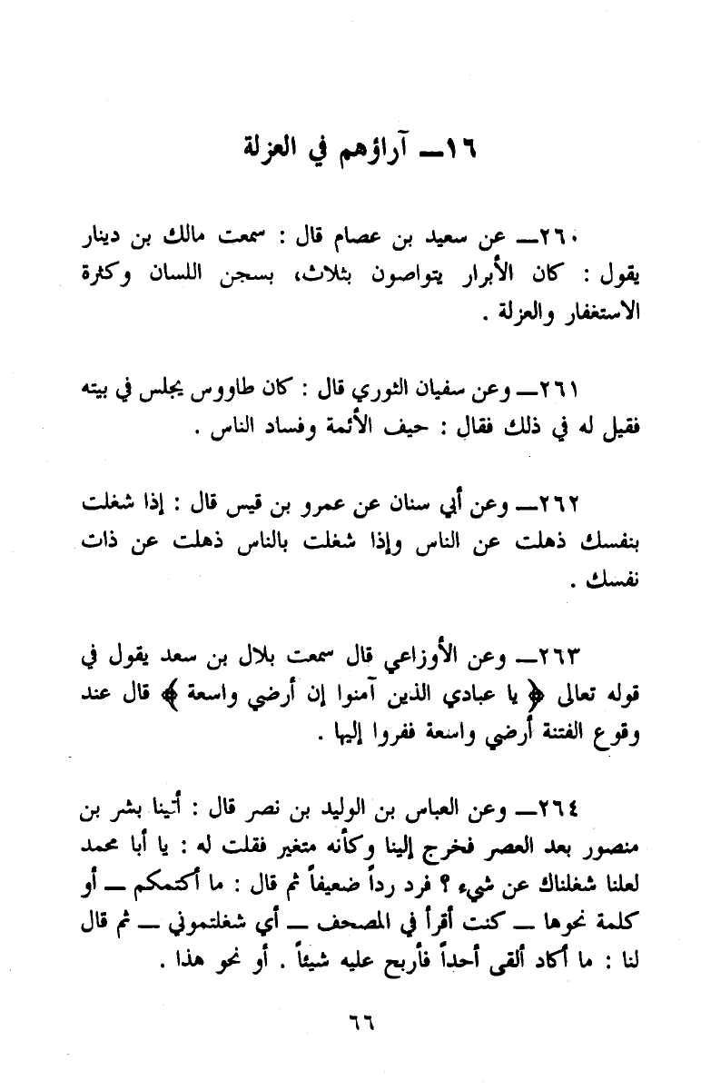 260 - (2/ 377) عَنْ سَعِيد بْنُ عِصَامٍ، قَالَ: سَمِعْتُ مَالِكَ بْنَ دِينَارٍ، يَقُولُ: " كَانَ الْأَبْرَارُ يَتَوَاصَوْنَ بَثَلَاثٍ: بِسِجْنِ اللِّسَانِ وَكَثْرَةِ الِاسْتِغْفَارِ وَالْعُزْلَةِ "