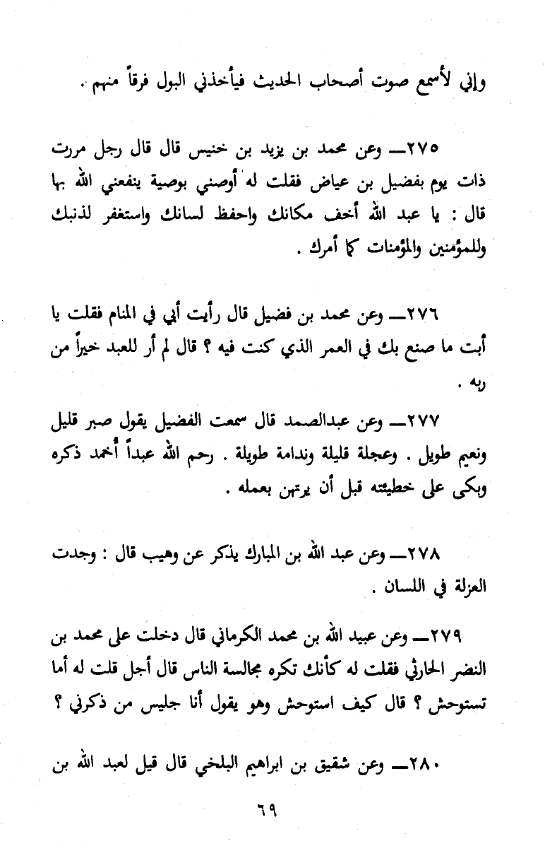 275 - (8/ 97) وعَنْ مُحَمَّد بْنُ يَزِيدَ بْنَ خُنَيْسٍ، قَالَ: قَالَ رَجُلٌ: مَرَرْتُ ذَاتَ يَوْمٍ بِفُضَيْلِ بْنِ عِيَاضٍ فَقُلْتُ لَهُ: أَوْصِنِي بِوَصِيَّةٍ يَنْفَعُنِي اللهُ بِهَا قَالَ: «يَا عَبْدَ اللهِ أَخَفِ مَكَانَكَ، وَاحْفَظْ لِسَانَكَ وَاسْتَغْفَرْ لِذَنْبِكَ وَلِلْمُؤْمِنِينَ وَالْمُؤْمِنَاتِ كَمَا أَمَرَكَ»