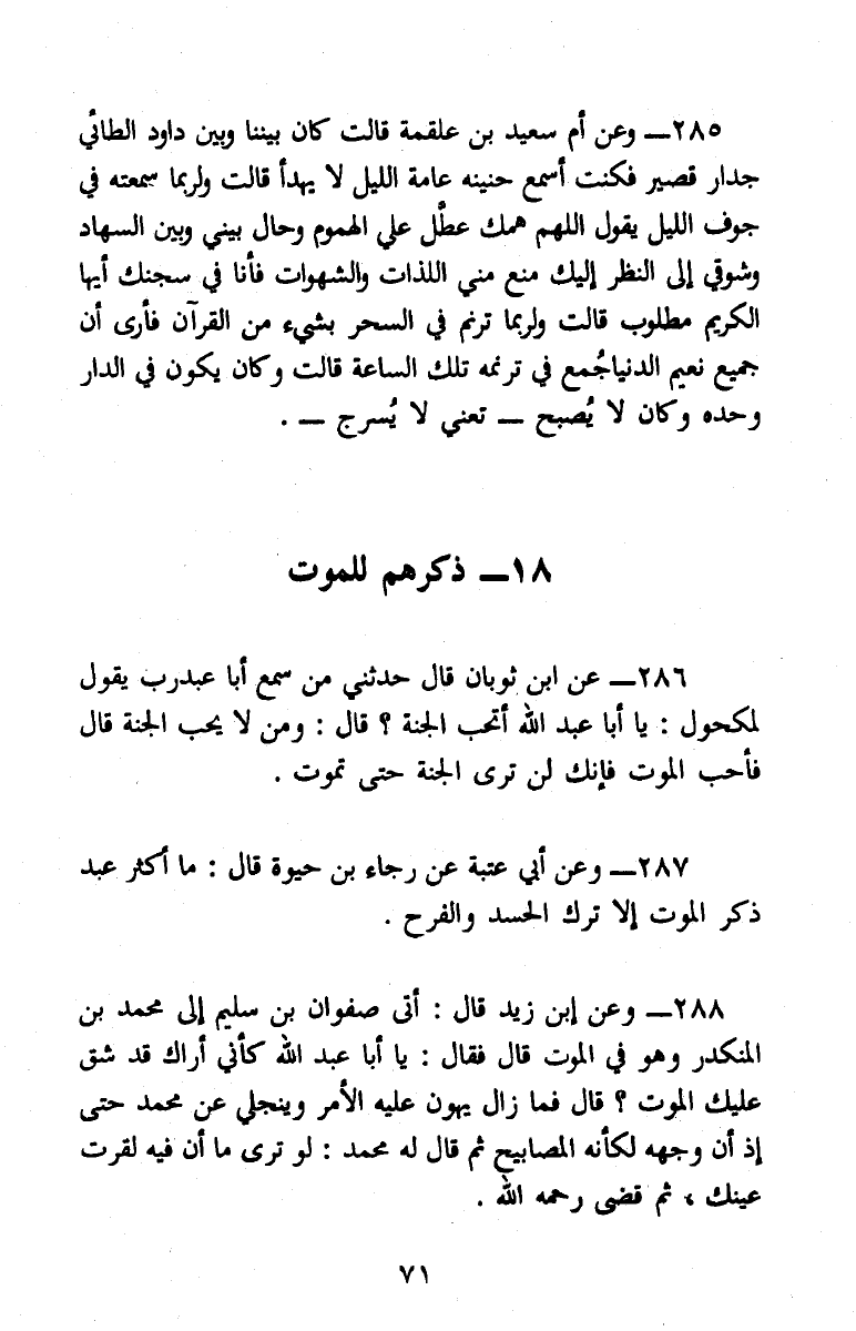 286 - (5/ 177) عَنْ ابْنِ ثَوْبَانَ، حَدَّثَنِي مَنْ سَمِعَ أَبَا عَبْدِ رَبِّ يَقُولُ لِمَكْحُولٍ: يَا أَبَا عَبْدِ اللهِ، أَتُحِبُّ الْجَنَّةَ؟ قَالَ: «وَمَنْ لَا يُحِبُّ الْجَنَّةَ؟» قَالَ: فَأَحِبَّ الْمَوْتَ، فَإِنَّكَ لَنْ تَرَى الْجَنَّةَ حَتَّى تَمُوتَ.