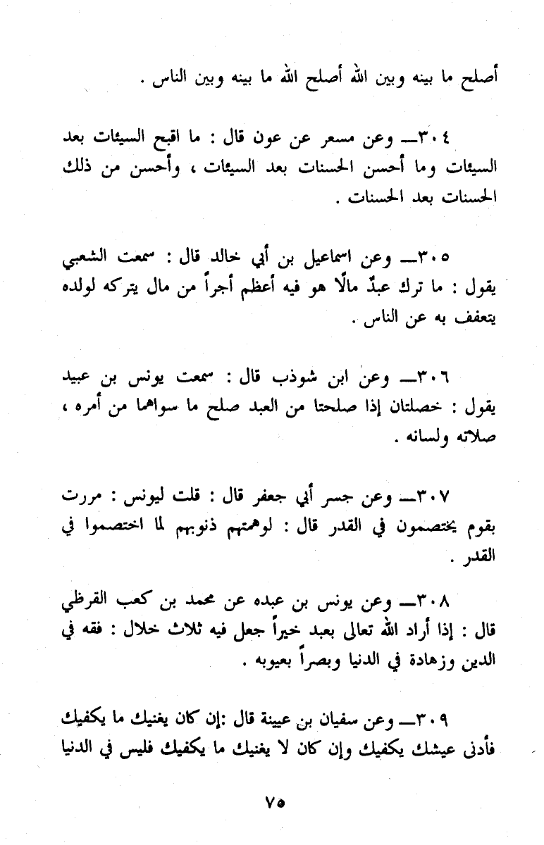 304 - (4/ 249) عَنْ مِسْعَرٍ، عَنْ عَوْنٍ، قَالَ: «مَا أَقْبَحَ السَّيِّئَاتِ بَعْدَ السَّيِّئَاتِ، وَمَا أَحْسَنَ الْحَسَنَاتِ بَعْدَ السَّيِّئَاتِ، وَأَحْسَنُ مِنْ ذَلِكَ الْحَسَنَاتُ بَعْدَ الْحَسَنَاتِ»