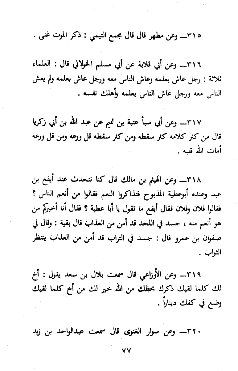 316 - (5/ 121) عَنْ أَبِي قِلَابَةَ، عَنْ أَبِي مُسْلِمٍ الْخَوْلَانِيِّ، قَالَ: الْعُلَمَاءُ ثَلَاثَةٌ: رَجُلٌ عَاشَ بِعِلْمِهِ وَعَاشَ النَّاسُ مَعَهُ، وَرَجُلٌ عَاشَ بِعِلْمِهِ وَلَمْ يَعِشِ النَّاسُ مَعَهُ، وَرَجُلٌ عَاشَ النَّاسُ بِعِلْمِهِ وَأَهْلَكَ نَفْسَهُ.