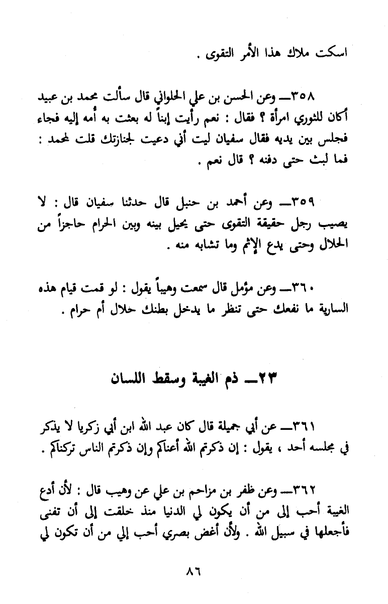 359 - (7/ 288) وعَنْ أحمد بن حنبل قال حدثنا سُفْيَانُ، قَالَ: «لَا يُصِيبُ رَجُلٌ حَقِيقَةَ التَّقْوَى حَتَّى يُحِيلَ بَيْنَهُ وَبَيْنَ الْحَرَامِ حَاجِزًا مِنَ الْحَلَالِ، وَحَتَّى يَدَعَ الْإِثْمَ وَمَا تَشَابَهَ مِنْهُ»