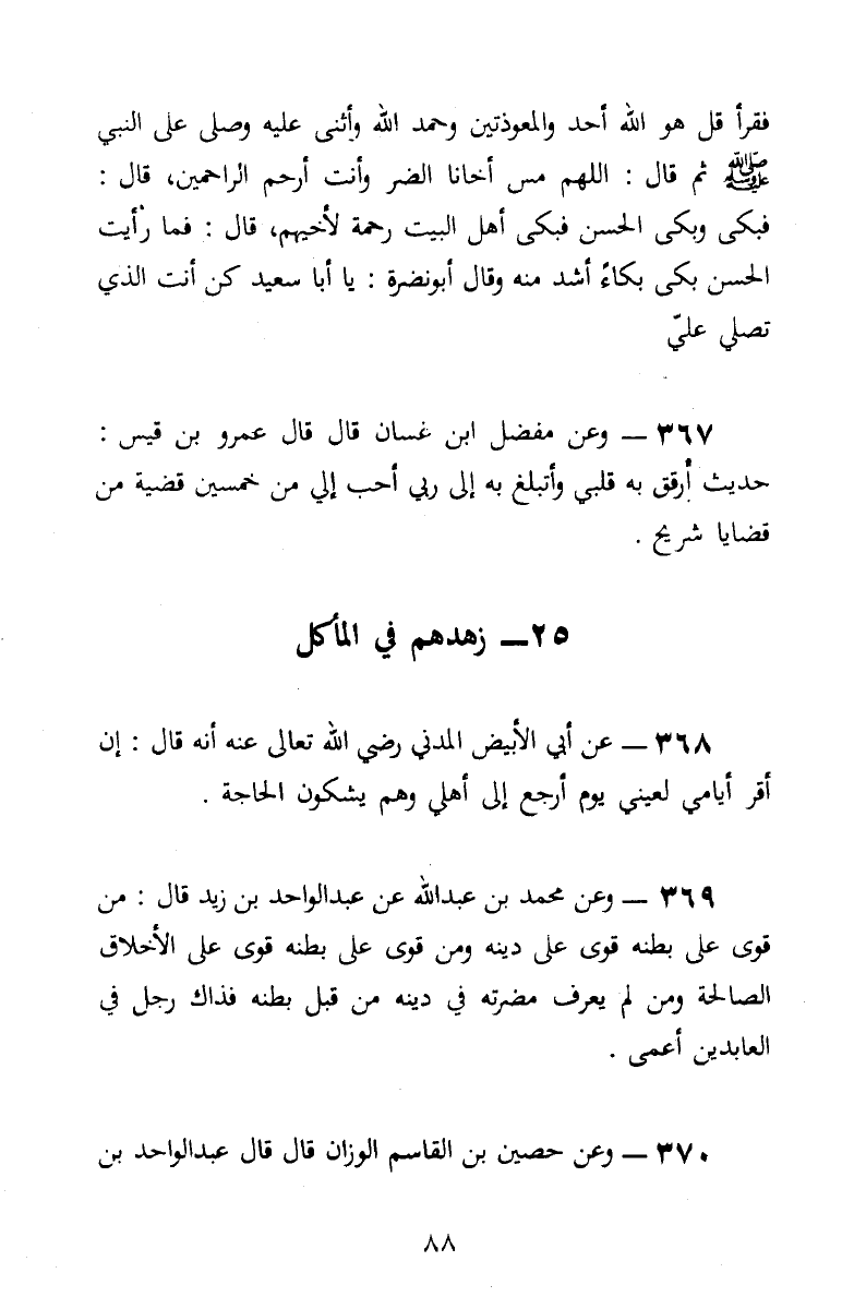 369 - (6/ 157) وعَنْ مُحَمَّد بْنُ عَبْدِ اللهِ، عَنْ عَبْدِ الْوَاحِدِ بْنِ زَيْدٍ، قَالَ: مَنْ قَوِيَ عَلَى بَطْنِهِ قَوِيَ عَلَى دِينِهِ، وَمَنْ قَوِيَ عَلَى بَطْنِهِ قَوِيَ عَلَى الْأَخْلَاقِ الصَّالِحَةِ، وَمَنْ لَمْ يَعْرِفْ مَضَرَّتَهُ فِي دِينِهِ مِنْ قِبَلِ بَطْنِهِ فَذَاكَ رَجُلٌ فِي الْعَابِدِينَ أَعْمَى "