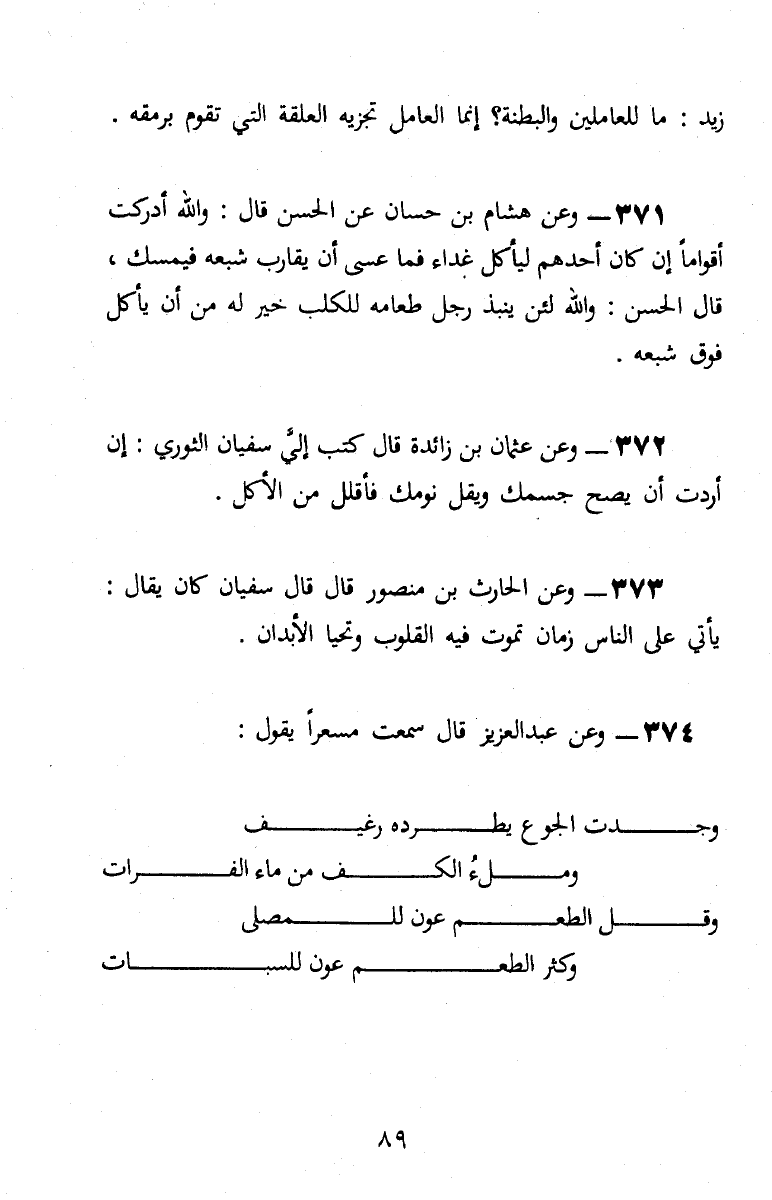 372 - (7/ 7) وعَنْ عُثْمَان بْنُ زَائِدَةَ، قَالَ: " كَتَبَ إِلِيَّ سُفْيَانُ الثَّوْرِيُّ: «إِنْ أَرَدْتَ أَنْ يَصِحَّ جِسْمُكَ وَيَقِلَّ نَوْمُكَ فَأَقْلِلْ مِنَ الْأَكْلِ»