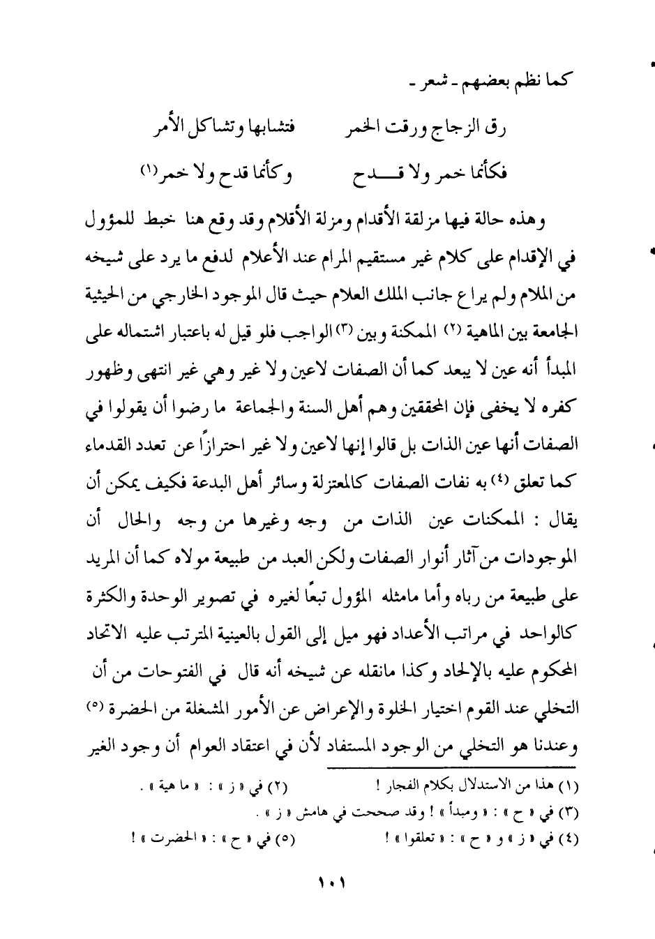 وَهَذِه حَالَة فِيهَا مزلقة الْأَقْدَام ومزلة الأقلام وَقد وَقع هُنَا خبط للمؤول فِي الْإِقْدَام على كَلَام غير مُسْتَقِيم المرام عِنْد الْأَعْلَام لدفع مَا يرد على شَيْخه من الملام وَلم يراع جَانب الْملك العلام حَيْثُ قَالَ الْمَوْجُود الْخَارِجِي من الْحَيْثِيَّة الجامعة بَين الْمَاهِيّة الممكنة وَبَين الْوَاجِب فَلَو قيل لَهُ بِاعْتِبَار اشتماله على المبدأ أَنه عين لَا يبعد كَمَا أَن الصِّفَات لَا عين وَلَا غير وَهِي غير انْتهى وَظُهُور كفره لَا يخفى فَإِن الْمُحَقِّقين وهم أهل السّنة وَالْجَمَاعَة مَا رَضوا أَن يَقُولُوا فِي الصِّفَات أَنَّهَا عين الذَّات بل قَالُوا إِنَّهَا لَا عين وَلَا غير احْتِرَازًا عَن تعدد القدماء كَمَا تعلق بِهِ نفات الصِّفَات كالمعتزلة وَسَائِر أهل الْبِدْعَة فَكيف يُمكن أَن يُقَال الممكنات عين الذَّات من وَجه وَغَيرهَا من وَجه وَالْحَال أَن الموجودات من آثَار أنوار الصِّفَات وَلَكِن العَبْد من طبيعة مَوْلَاهُ كَمَا أَن المريد على طبيعة من رباه وَأما مَا مثله المؤول تبعا لغيره فِي تَصْوِير الْوحدَة وَالْكَثْرَة كالواحد فِي مَرَاتِب الْأَعْدَاد فَهُوَ ميل إِلَى القَوْل بالعينية الْمُتَرَتب عَلَيْهِ الِاتِّحَاد الْمَحْكُوم عَلَيْهِ بالإلحاد وَكَذَا مَا نَقله عَن شَيْخه أَنه قَالَ فِي الفتوحات من أَن التخلي عِنْد الْقَوْم اخْتِيَار الْخلْوَة والإعراض عَن الْأُمُور المشغلة من الحضرة وَعِنْدنَا هُوَ التخلي من الْوُجُود الْمُسْتَفَاد لِأَن فِي اعْتِقَاد الْعَوام أَن وجود الْغَيْر