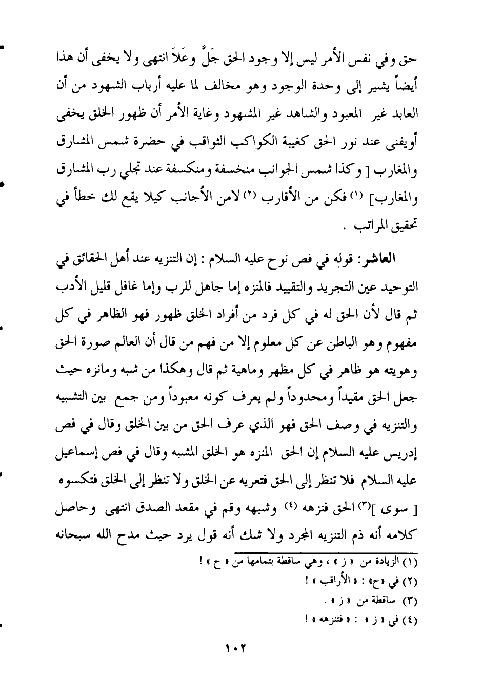 الْعَاشِر قَوْله فِي فص نوح عَلَيْهِ السَّلَام إِن التَّنْزِيه عِنْد أهل الْحَقَائِق فِي التَّوْحِيد عين التَّجْرِيد وَالتَّقْيِيد فالمنزه إِمَّا جَاهِل للرب وَإِمَّا غافل قَلِيل الْأَدَب ثمَّ قَالَ لِأَن الْحق لَهُ فِي كل فَرد من أَفْرَاد الْخلق ظُهُور فَهُوَ الظَّاهِر فِي كل مَفْهُوم وَهُوَ الْبَاطِن عَن كل مَعْلُوم إِلَّا من فهم من قَالَ أَن الْعَالم صُورَة الْحق وهويته هُوَ ظَاهر فِي كل مظهر وماهية ثمَّ قَالَ وَهَكَذَا من شبه وَمَا نزه حَيْثُ جعل الْحق مُقَيّدا ومحدودا وَلم يعرف كَونه معبودا وَمن جمع بَين التَّشْبِيه والتنزيه فِي وصف الْحق فَهُوَ الَّذِي عرف الْحق من بَين الْخلق وَقَالَ فِي فص إِدْرِيس عَلَيْهِ السَّلَام إِن الْحق المنزه هُوَ الْخلق الْمُشبه وَقَالَ فِي فص إِسْمَاعِيل عَلَيْهِ السَّلَام فَلَا تنظر إِلَى الْحق فتعريه عَن الْخلق وَلَا تنظر إِلَى الْخلق فتكسوه سوى الْحق فنزهه وَشبهه وقم فِي مقْعد الصدْق انْتهى وَحَاصِل كَلَامه أَنه ذمّ التَّنْزِيه الْمُجَرّد وَلَا شكّ أَنه قَول يرد حَيْثُ مدح الله سُبْحَانَهُ
