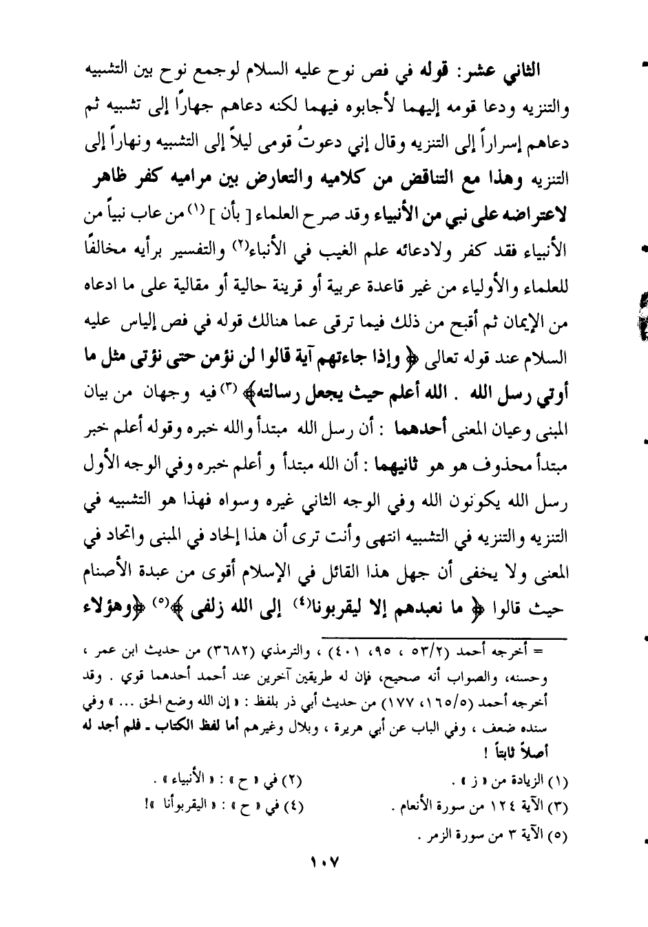 الثَّانِي عشر قَوْله فِي فص نوح عَلَيْهِ السَّلَام لَو جمع نوح بَين التَّشْبِيه والتنزيه ودعا قومه إِلَيْهِمَا لأجابوه فيهمَا لكنه دعاهم جهارا إِلَى تَشْبِيه ثمَّ دعاهم إسرارا إِلَى التَّنْزِيه وَقَالَ إِنِّي دَعَوْت قومِي لَيْلًا إِلَى التَّشْبِيه وَنَهَارًا إِلَى التَّنْزِيه وَهَذَا مَعَ التَّنَاقُض من كلاميه والتعارض بَين مراميه كفر ظَاهر لاعتراضه على نَبِي من الْأَنْبِيَاء وَقد صرح الْعلمَاء بِأَن من عَابَ نَبيا من الْأَنْبِيَاء فقد كفر ولادعائه علم الْغَيْب فِي الأنباء وَالتَّفْسِير بِرَأْيهِ مُخَالفا للْعُلَمَاء والأولياء من غير قَاعِدَة عَرَبِيَّة أَو قرينَة حَالية أَو مقالية على مَا ادَّعَاهُ من الْإِيمَان ثمَّ أقبح من ذَلِك فِيمَا ترقى عَمَّا هُنَالك قَوْله فِي فص إلْيَاس عَلَيْهِ السَّلَام عِنْد قَوْله تَعَالَى {وَإِذا جَاءَتْهُم آيَة قَالُوا لن نؤمن حَتَّى نؤتى مثل مَا أُوتِيَ رسل الله الله أعلم حَيْثُ يَجْعَل رسَالَته} فِيهِ وَجْهَان من بَيَان المبنى وعيان الْمَعْنى أَحدهمَا أَن رسل الله مُبْتَدأ وَالله خَبره وَقَوله أعلم خبر مُبْتَدأ مَحْذُوف هُوَ هُوَ ثَانِيهمَا أَن الله مُبْتَدأ وَأعلم خَبره وَفِي الْوَجْه الأول رسل الله يكونُونَ الله وَفِي الْوَجْه الثَّانِي غَيره وسواه فَهَذَا هُوَ التَّشْبِيه فِي التَّنْزِيه والتنزيه فِي التَّشْبِيه انْتهى وَأَنت ترى أَن هَذَا إلحاد فِي المبنى واتحاد فِي الْمَعْنى وَلَا يخفى أَن جهل هَذَا الْقَائِل فِي الْإِسْلَام أقوى من عَبدة الْأَصْنَام حَيْثُ قَالُوا {مَا نعبدهم إِلَّا ليقربونا إِلَى الله زلفى} و {هَؤُلَاءِ شفعاؤنا عِنْد الله}