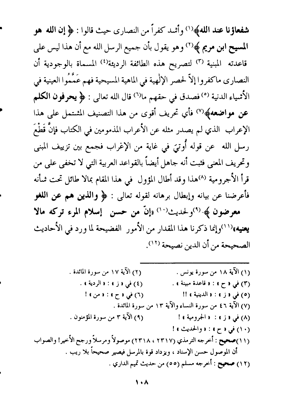 ) وَأَشد كفرا من النَّصَارَى حَيْثُ قَالُوا {إِن الله هُوَ الْمَسِيح ابْن مَرْيَم} وَهُوَ يَقُول بِأَن جَمِيع الرُّسُل الله مَعَ أَن هَذَا لَيْسَ على قَاعِدَته المبنية لتصريح هَذِه الطَّائِفَة الرَّديئَة الْمُسَمَّاة بالوجودية أَن النَّصَارَى مَا كفرُوا إِلَّا لحصر الإلهية فِي الْمَاهِيّة المسيحية فهم عمموا العينية فِي الْأَشْيَاء الدنية فَصدق فِي حَقهم مَا قَالَ الله تَعَالَى {يحرفُونَ الْكَلم عَن موَاضعه} فَأَي تَحْرِيف أقوى من هَذَا التصنيف الْمُشْتَمل على هَذَا الْإِعْرَاب الَّذِي لم يصدر مثله عَن الْأَعْرَاب المذمومين فِي الْكتاب فَإِن قطع رسل الله عَن قَوْله أُوتِيَ فِي غَايَة من الإغراب فَجمع بَين تزييف المبنى وتحريف الْمَعْنى فَثَبت أَنه جَاهِل أَيْضا بالقواعد الْعَرَبيَّة الَّتِي لَا تخفى على من قَرَأَ الأجرومية هَذَا وَقد أَطَالَ المؤول فِي هَذَا الْمقَام بِمَا لَا طائل تَحت شَأْنه فأعرضنا عَن بَيَانه وَإِبْطَال برهانه لقَوْله تَعَالَى {وَالَّذين هم عَن اللَّغْو معرضون} وَلِحَدِيث (إِن من حسن إِسْلَام الْمَرْء تَركه مَا لَا يعنيه) وَإِنَّمَا ذكرنَا هَذَا الْمِقْدَار من الْأُمُور الفضيحة لما ورد فِي الْأَحَادِيث الصَّحِيحَة من أَن الدّين النَّصِيحَة