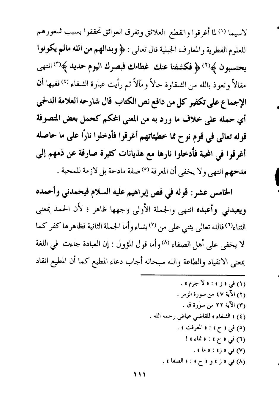 لَا سِيمَا لما أغرقوا وَانْقطع العلائق وتفرق الْعَوَائِق تحققوا بِسَبَب شُعُورهمْ للعلوم الفطرية والمعارف الجبلية قَالَ تَعَالَى {وبدا لَهُم من الله مَا لم يَكُونُوا يحتسبون} {فكشفنا عَنْك غطاءك فبصرك الْيَوْم حَدِيد} انْتهى مقَالا ونعوذ بِاللَّه من الشقاوة حَالا ومآلا ثمَّ رَأَيْت عبارَة الشِّفَاء فَفِيهَا أَن الْإِجْمَاع على تَكْفِير كل من دَافع نَص الْكتاب قَالَ شَارِحه الْعَلامَة الدلجي أَي حمله على خلاف مَا ورد بِهِ من الْمَعْنى الْمُحكم كحمل بعض المتصوفة قَوْله تَعَالَى فِي قوم نوح مِمَّا خطيئاتهم أغرقوا فأدخلوا نَارا على مَا حَاصله أغرقوا فِي الْمحبَّة فأدخلوا نارها مَعَ هذيانات كَثِيرَة صارفة عَن ذمهم إِلَى مدحهم انْتهى وَلَا يخفى أَن الْمعرفَة صفة مادحة بل لَازِمَة للمحبة