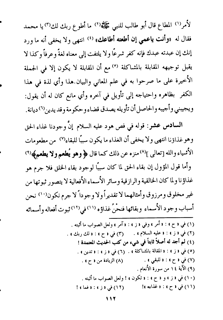 السَّادِس عشر قَوْله فِي فص هود عَلَيْهِ السَّلَام إِن وجودنا غذَاء الْحق وَهُوَ غذاؤنا انْتهى وَلَا يخفى أَن الْغذَاء مَا يكون سَببا للبقاء من مطعومات الْأَشْيَاء وَالله تَعَالَى منزه عَن ذَلِك كَمَا قَالَ {وَهُوَ يطعم وَلَا يطعم} وَأما قَول المؤول إِن بَقَاء الْحق لما كَانَ سَببا لوُجُود بَقَاء الْخلق فَلَا جرم هُوَ غذاؤنا وَلما كَانَ الخالقية والرازقية وَسَائِر الْأَسْمَاء الأفعالية لَا يتَصَوَّر ثُبُوتهَا من غير مَخْلُوق ومرزوق وأمثالهما لَا تَقْديرا وَلَا وجودا لَا جرم نَكُون نَحن أَسبَاب وجود الْأَسْمَاء وبقائها فَنحْن غذاؤه فِي ثُبُوت أَفعاله وأسمائه