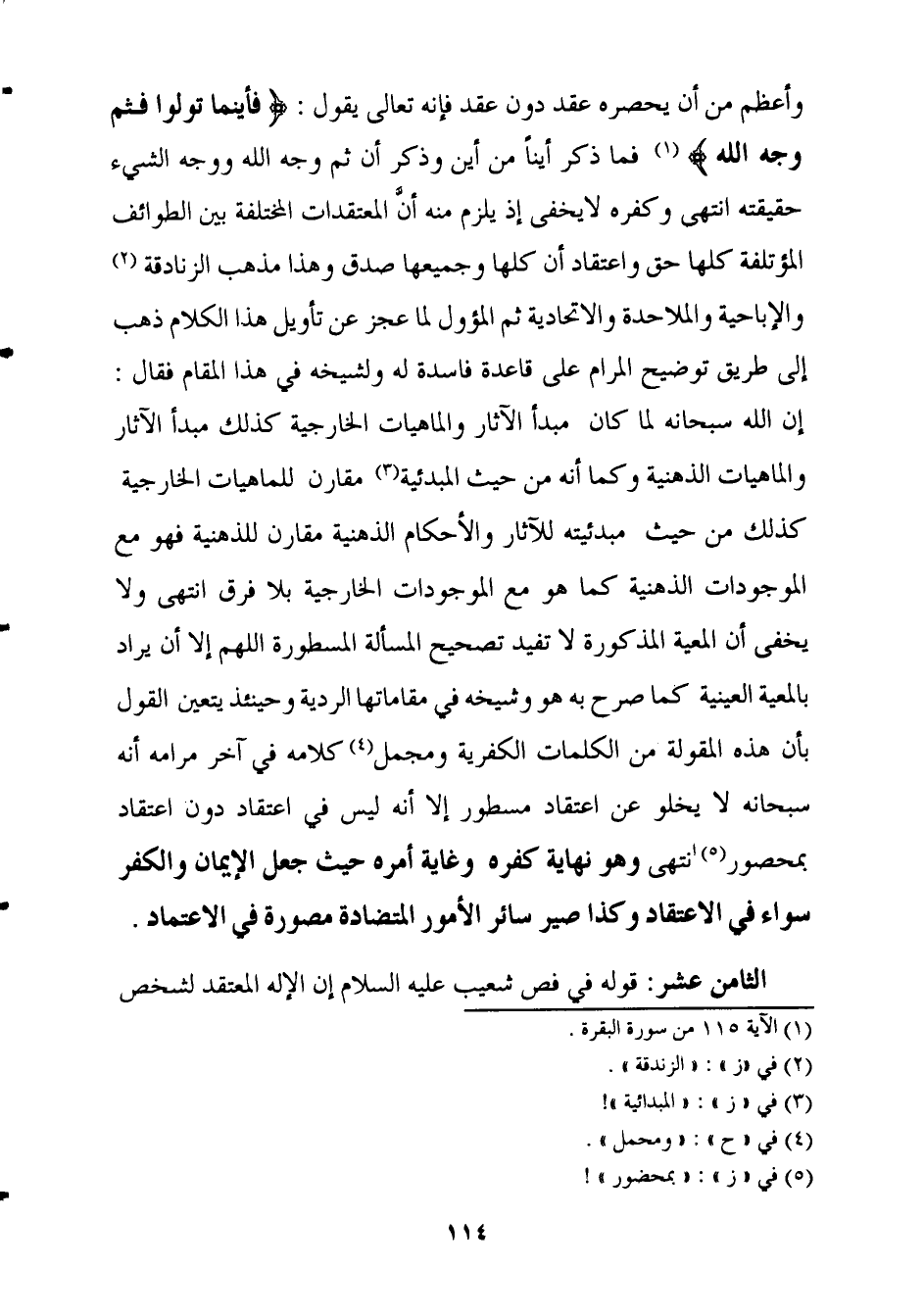 وَأعظم من أَن يحصره عقد دون عقد فَإِنَّهُ تَعَالَى يَقُول {فأينما توَلّوا فثم وَجه الله} فَمَا ذكر أَيّنَا من أَيْن وَذكر أَن ثمَّ وَجه الله وَوجه الشَّيْء حَقِيقَته انْتهى وكفره لَا يخفى إِذْ يلْزم مِنْهُ أَن المعتقدات الْمُخْتَلفَة بَين الطوائف المؤتلفة كلهَا حق واعتقاد أَن كلهَا وجميعها صدق وَهَذَا مَذْهَب الزَّنَادِقَة والإباحية والملاحدة والاتحادية ثمَّ المؤول لما عجز عَن تَأْوِيل هَذَا الْكَلَام ذهب إِلَى طَرِيق توضيح المرام على قَاعِدَة فَاسِدَة لَهُ ولشيخه فِي هَذَا الْمقَام فَقَالَ إِن الله سُبْحَانَهُ لما كَانَ مبدأ الْآثَار والماهيات الخارجية كَذَلِك مبدأ الْآثَار والماهيات الذهنية وكما أَنه من حَيْثُ المبدئية مُقَارن للماهيات الخارجية كَذَلِك من حَيْثُ مبدئيته للآثار وَالْأَحْكَام الذهنية مُقَارن للذهنية فَهُوَ مَعَ الموجودات الذهنية كَمَا هُوَ مَعَ الموجودات الخارجية بِلَا فرق انْتهى وَلَا يخفى أَن الْمَعِيَّة الْمَذْكُورَة لَا تفِيد تَصْحِيح الْمَسْأَلَة المسطورة اللَّهُمَّ إِلَّا أَن يُرَاد بالمعية العينية كَمَا صرح بِهِ هُوَ وَشَيْخه فِي مقاماتها الردية وَحِينَئِذٍ يتَعَيَّن القَوْل بِأَن هَذِه المقولة من الْكَلِمَات الكفرية ومجمل كَلَامه فِي آخر مرامه أَنه سُبْحَانَهُ لَا يَخْلُو عَن اعْتِقَاد مسطور إِلَّا أَنه لَيْسَ فِي اعْتِقَاد دون اعْتِقَاد بمحصور انْتهى وَهُوَ نِهَايَة كفره وَغَايَة أمره حَيْثُ جعل الْإِيمَان وَالْكفْر سَوَاء فِي الِاعْتِقَاد وَكَذَا صير سَائِر الْأُمُور المتضادة مصورة فِي الِاعْتِمَاد