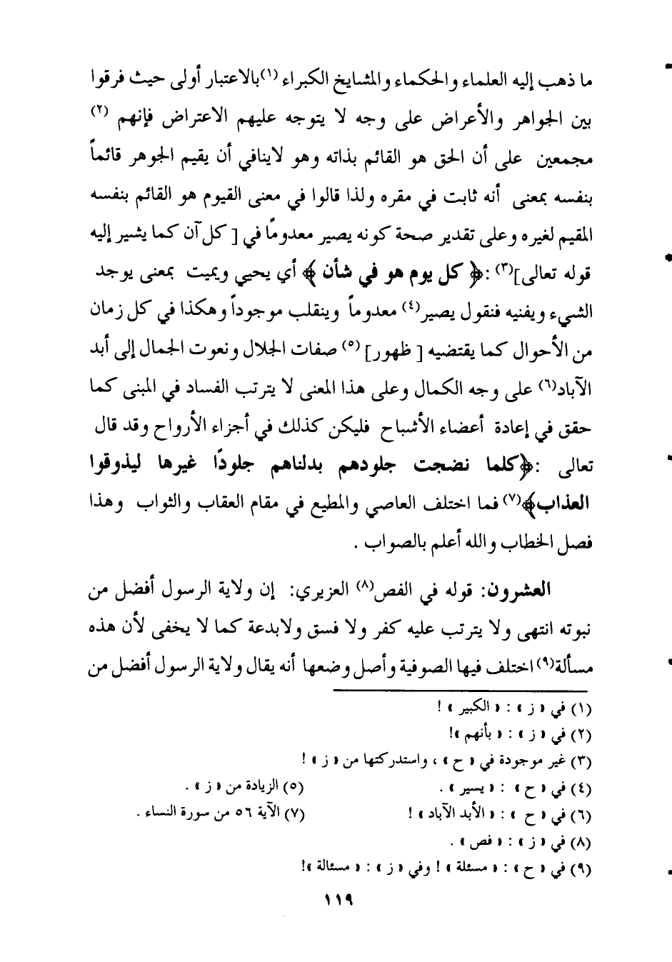 مَا ذهب إِلَيْهِ الْعلمَاء والحكماء والمشايخ الكبراء بِالِاعْتِبَارِ أولى حَيْثُ فرقوا بَين الْجَوَاهِر والأعراض على وَجه لَا يتَوَجَّه عَلَيْهِم الِاعْتِرَاض فَإِنَّهُم مُجْمِعِينَ على أَن الْحق هُوَ الْقَائِم بِذَاتِهِ وَهُوَ لَا يُنَافِي أَن يُقيم الْجَوْهَر قَائِما بِنَفسِهِ بِمَعْنى أَنه ثَابت فِي مقره وَلذَا قَالُوا فِي معنى القيوم هُوَ الْقَائِم بِنَفسِهِ الْمُقِيم لغيره وعَلى تَقْدِير صِحَة كَونه يصير مَعْدُوما فِي كل آن كَمَا يُشِير إِلَيْهِ قَوْله تَعَالَى {كل يَوْم هُوَ فِي شَأْن} أَي يحيي وَيُمِيت بِمَعْنى يُوجد الشَّيْء ويفنيه فَنَقُول يصير مَعْدُوما وينقلب مَوْجُودا وَهَكَذَا فِي كل زمَان من الْأَحْوَال كَمَا يَقْتَضِيهِ ظُهُور صِفَات الْجلَال ونعوت الْجمال إِلَى أَبَد الآباد على وَجه الْكَمَال وعَلى هَذَا الْمَعْنى لَا يَتَرَتَّب الْفساد فِي المبنى كَمَا حقق فِي إِعَادَة أَعْضَاء الأشباح فَلْيَكُن كَذَلِك فِي أَجزَاء الْأَرْوَاح وَقد قَالَ تَعَالَى {كلما نَضِجَتْ جُلُودهمْ بَدَّلْنَاهُمْ جُلُودًا غَيرهَا ليذوقوا الْعَذَاب} فَمَا اخْتلف العَاصِي والمطيع فِي مقَام الْعقَاب وَالثَّوَاب وَهَذَا فصل الْخطاب وَالله أعلم بِالصَّوَابِ