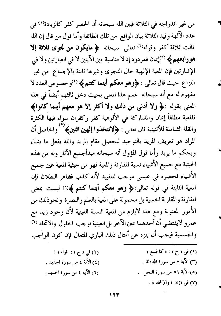 من غير اندراجه فِي الثَّلَاثَة فَبين الله سُبْحَانَهُ أَن الْحصْر كفر كالزيادة فِي عدد الْآلهَة وَقيد الثَّلَاثَة بَيَان الْوَاقِع من تِلْكَ الطَّائِفَة وَأما قَول من قَالَ إِن الله ثَالِث ثَلَاثَة كفر وَقَوله تَعَالَى سُبْحَانَهُ {مَا يكون من نجوى ثَلَاثَة إِلَّا هُوَ رابعهم} إِيمَان فمردود إِذْ لَا مُنَاسبَة بَين الْآيَتَيْنِ لَا فِي العبارتين وَلَا فِي الإشارتين فَإِن الْمَعِيَّة الإلهية حَال النَّجْوَى وَغَيرهَا ثَابِتَة بِالْإِجْمَاع من غير النزاع حَيْثُ قَالَ تَعَالَى {وَهُوَ مَعكُمْ أَيْن مَا كُنْتُم} وخصوص الْعدَد لَا مَفْهُوم لَهُ مَعَ أَنه سُبْحَانَهُ عمم هَذَا الْمَعْنى بِحَيْثُ دخل ثالثهم أَيْضا فِي هَذَا الْمَعْنى بقوله {وَلَا أدنى من ذَلِك وَلَا أَكثر إِلَّا هُوَ مَعَهم أَيْن مَا كَانُوا} فالمعية مُطلقًا إِيمَان والمشاركة فِي الألوهية كفر وكفران سوءا فِيهَا الْكَثْرَة والقلة الشاملة للأثنينية قَالَ تَعَالَى {لَا تَتَّخِذُوا إِلَهَيْنِ اثْنَيْنِ} وَالْحَاصِل أَن المُرَاد هُوَ تَعْرِيف المريد بِالتَّوْحِيدِ ليحصل مقَام المريد وَالله يفعل مَا يَشَاء وَيحكم مَا يُرِيد وَأما قَول المؤول أَنه سُبْحَانَهُ مبدأ جَمِيع الْآثَار وَله من هَذِه الْحَيْثِيَّة مَعَ جَمِيع الْأَشْيَاء نِسْبَة الْمُقَارنَة والمعية فَهُوَ من حيثية الْمَعِيَّة عين جَمِيع الْأَشْيَاء فحصره فِي عِيسَى مُوجب للتَّقْيِيد لِأَنَّهُ كذب فَظَاهر الْبطلَان فَإِن الْمَعِيَّة الثَّابِتَة فِي قَوْله تَعَالَى {وَهُوَ مَعكُمْ أَيْن مَا كُنْتُم} لَيست بِمَعْنى الْمُقَارنَة والمقاربة الحسية بل مَحْمُولَة على الْمَعِيَّة بِالْعلمِ والنصرة وَنَحْو ذَلِك من الْأُمُور المعنوية وَمَعَ هَذَا لَا يلْزم من الْمَعِيَّة النِّسْبَة العينية لِأَن وجود زيد مَعَ عَمْرو لَا يَقْتَضِي أَن أَحدهمَا عين الآخر بل العينية توجب الْحُلُول والاتحاد والجسمية فَيجب أَن ينزه عَن أَمْثَال ذَلِك الْبَارِي المتعال فَإِن كَون الْوَاجِب