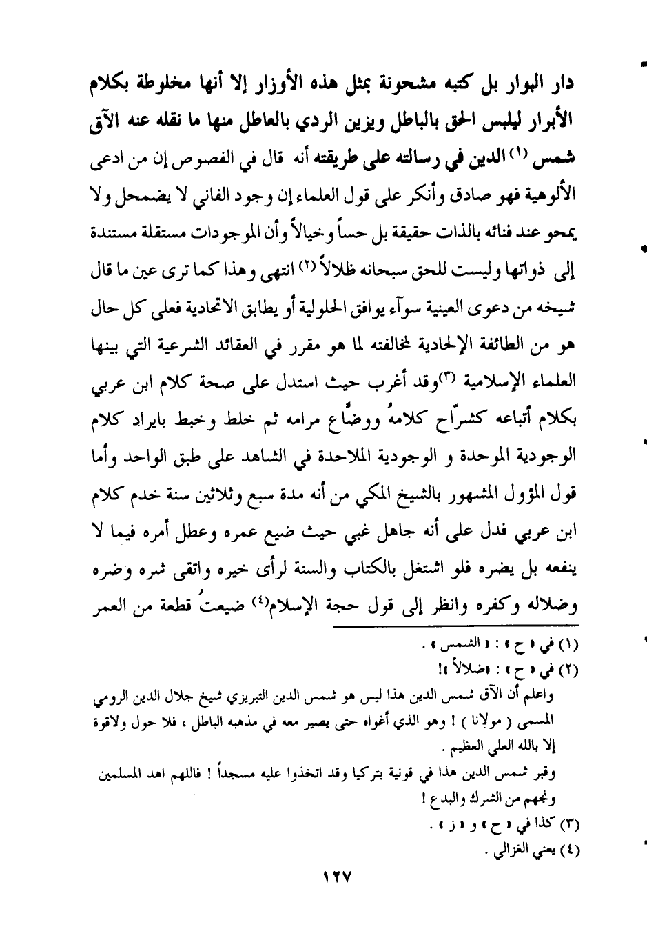 دَار الْبَوَار بل كتبه مشحونة بِمثل هَذِه الأوزار إِلَّا أَنَّهَا مخلوطة بِكَلَام الْأَبْرَار ليلبس الْحق بِالْبَاطِلِ ويزين الردي بالعاطل مِنْهَا مَا نَقله عَنهُ الآق شمس الدّين فِي رسَالَته على طَرِيقَته أَنه قَالَ فِي الفصوص إِن من ادّعى الألوهية فَهُوَ صَادِق وَأنكر على قَول الْعلمَاء إِن وجود الفاني لَا يضمحل وَلَا يمحو عِنْد فنائه بِالذَّاتِ حَقِيقَة بل حسا وخيالا وَأَن الموجودات مُسْتَقلَّة مستندة إِلَى ذواتها وَلَيْسَت للحق سُبْحَانَهُ ظلالا انْتهى وَهَذَا كَمَا ترى عين مَا قَالَ شَيْخه من دَعْوَى العينية سَوَاء يُوَافق الحلولية أَو يُطَابق الاتحادية فعلى كل حَال هُوَ من الطَّائِفَة الإلحادية لمُخَالفَته لما هُوَ مُقَرر فِي العقائد الشَّرْعِيَّة الَّتِي بَينهَا الْعلمَاء الإسلامية وَقد أغرب حَيْثُ اسْتدلَّ على صِحَة كَلَام ابْن عَرَبِيّ بِكَلَام أَتْبَاعه كشراح كَلَامه ووضاع مرامه ثمَّ خلط وخبط بإيراد كَلَام الوجودية الْمُوَحدَة والوجودية الْمَلَاحِدَة فِي الشَّاهِد على طبق الْوَاحِد وَأما قَول المؤول الْمَشْهُور بالشيخ الْمَكِّيّ من أَنه مُدَّة سبع وَثَلَاثِينَ سنة خدم كَلَام ابْن عَرَبِيّ فَدلَّ على أَنه جَاهِل غبي حَيْثُ ضيع عمره وعطل أمره فِيمَا لَا يَنْفَعهُ بل يضرّهُ فَلَو اشْتغل بِالْكتاب وَالسّنة لرَأى خَيره وَاتَّقَى شَره وضره وضلاله وكفره وَانْظُر إِلَى قَول حجَّة الْإِسْلَام ضيعت قِطْعَة من الْعُمر