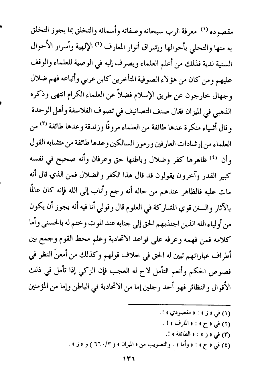 مَقْصُوده معرفَة الرب سُبْحَانَهُ وَصِفَاته وأسمائه والتخلق بِمَا يجوز التخلق بِهِ مِنْهَا والتحلي بأحوالها وإشراق أنوار المعارف الإلهية وأسرار الْأَحْوَال السّنيَّة لَدَيْهِ فَذَلِك من أعلم الْعلمَاء وَيصرف إِلَيْهِ فِي الْوَصِيَّة للْعُلَمَاء وَالْوَقْف عَلَيْهِم وَمن كَانَ من هَؤُلَاءِ الصُّوفِيَّة الْمُتَأَخِّرين كَابْن عَرَبِيّ وَأَتْبَاعه فهم ضلال وجهال خارجون عَن طَرِيق الْإِسْلَام فضلا عَن الْعلمَاء الْكِرَام انْتهى وَذكره الذَّهَبِيّ فِي الْمِيزَان فَقَالَ صنف التصانيف فِي تصوف الفلاسفة وَأهل الْوحدَة وَقَالَ أَشْيَاء مُنكرَة عدهَا طَائِفَة من الْعلمَاء مروقا وزندقة وعدها طَائِفَة من الْعلمَاء من إرشادات العارفين ورموز السالكين وعدها طَائِفَة من متشابه القَوْل وَأَن ظَاهرهَا كفر وضلال وباطنها حق وعرفان وَأَنه صَحِيح فِي نَفسه كَبِير الْقدر وَآخَرُونَ يَقُولُونَ قد قَالَ هَذَا الْكفْر والضلال فَمن الَّذِي قَالَ أَنه مَاتَ عَلَيْهِ فَالظَّاهِر عِنْدهم من حَاله أَنه رَجَعَ وأناب إِلَى الله فَإِنَّهُ كَانَ عَالما بالآثار وَالسّنَن قوي الْمُشَاركَة فِي الْعُلُوم قَالَ وَقَوْلِي أَنا فِيهِ أَنه يجوز أَن يكون من أَوْلِيَاء الله الَّذين اجتذبهم الْحق إِلَى جنابه عِنْد الْمَوْت وَختم لَهُ بِالْحُسْنَى وَأما كَلَامه فَمن فهمه وعرفه على قَوَاعِد الاتحادية وَعلم محط الْقَوْم وَجمع بَين أَطْرَاف عباراتهم تبين لَهُ الْحق فِي خلاف قَوْلهم وَكَذَلِكَ من أمعن النّظر فِي فصوص الحكم وأنعم التَّأَمُّل لَاحَ لَهُ الْعجب فَإِن الزكي إِذا تَأمل فِي ذَلِك الْأَقْوَال والنظائر فَهُوَ أحد رجلَيْنِ إِمَّا من الاتحادية فِي الْبَاطِن وَإِمَّا من الْمُؤمنِينَ