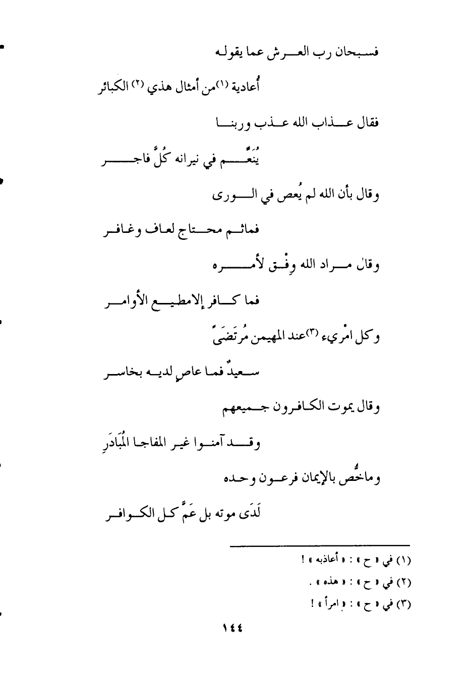 (فسبحان رب الْعَرْش عَمَّا يَقُوله ... أعاديه من أَمْثَال هذي الْكَبَائِر)