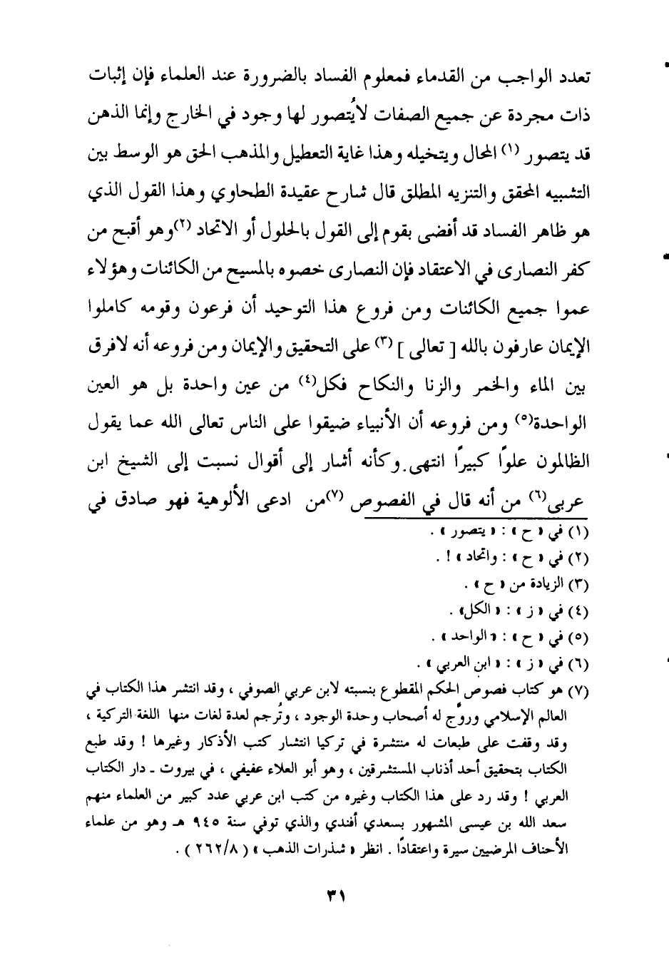 تعدد الْوَاجِب من القدماء فمعلوم الْفساد بِالضَّرُورَةِ عِنْد الْعلمَاء فَإِن إِثْبَات ذَات مُجَرّدَة عَن جَمِيع الصِّفَات لَا يتَصَوَّر لَهَا وجود فِي الْخَارِج وَإِنَّمَا الذِّهْن قد يتَصَوَّر الْمحَال ويتخيله وَهَذَا غَايَة التعطل وَالْمذهب الْحق هُوَ الْوسط بَين التَّشْبِيه الْمُحَقق والتنزيه الْمُطلق قَالَ شَارِح عقيدة الطَّحَاوِيّ وَهَذَا القَوْل الَّذِي هُوَ ظَاهر الْفساد قد أفْضى بِقوم إِلَى القَوْل بالحلول أَو الِاتِّحَاد وَهُوَ أقبح من كفر النَّصَارَى فِي الِاعْتِقَاد فَإِن النَّصَارَى خصوه بالمسيح من الكائنات وَهَؤُلَاء عموا جَمِيع الكائنات وَمن فروع هَذَا التَّوْحِيد أَن فِرْعَوْن وَقَومه كاملوا الْإِيمَان عارفون بِاللَّه تَعَالَى على التَّحْقِيق وَالْإِيمَان وَمن فروعه أَنه لَا فرق بَين المَاء وَالْخمر وَالزِّنَا وَالنِّكَاح فَكل من عين وَاحِدَة بل هُوَ الْعين الْوَاحِدَة وَمن فروعه أَن الْأَنْبِيَاء ضيقوا على النَّاس تَعَالَى الله عَمَّا يَقُول الظَّالِمُونَ علوا كَبِيرا انْتهى وَكَأَنَّهُ أَشَارَ إِلَى أَقْوَال نسبت إِلَى الشَّيْخ ابْن عَرَبِيّ من أَنه قَالَ فِي الفصوص من ادّعى الألوهية فَهُوَ صَادِق فِي
