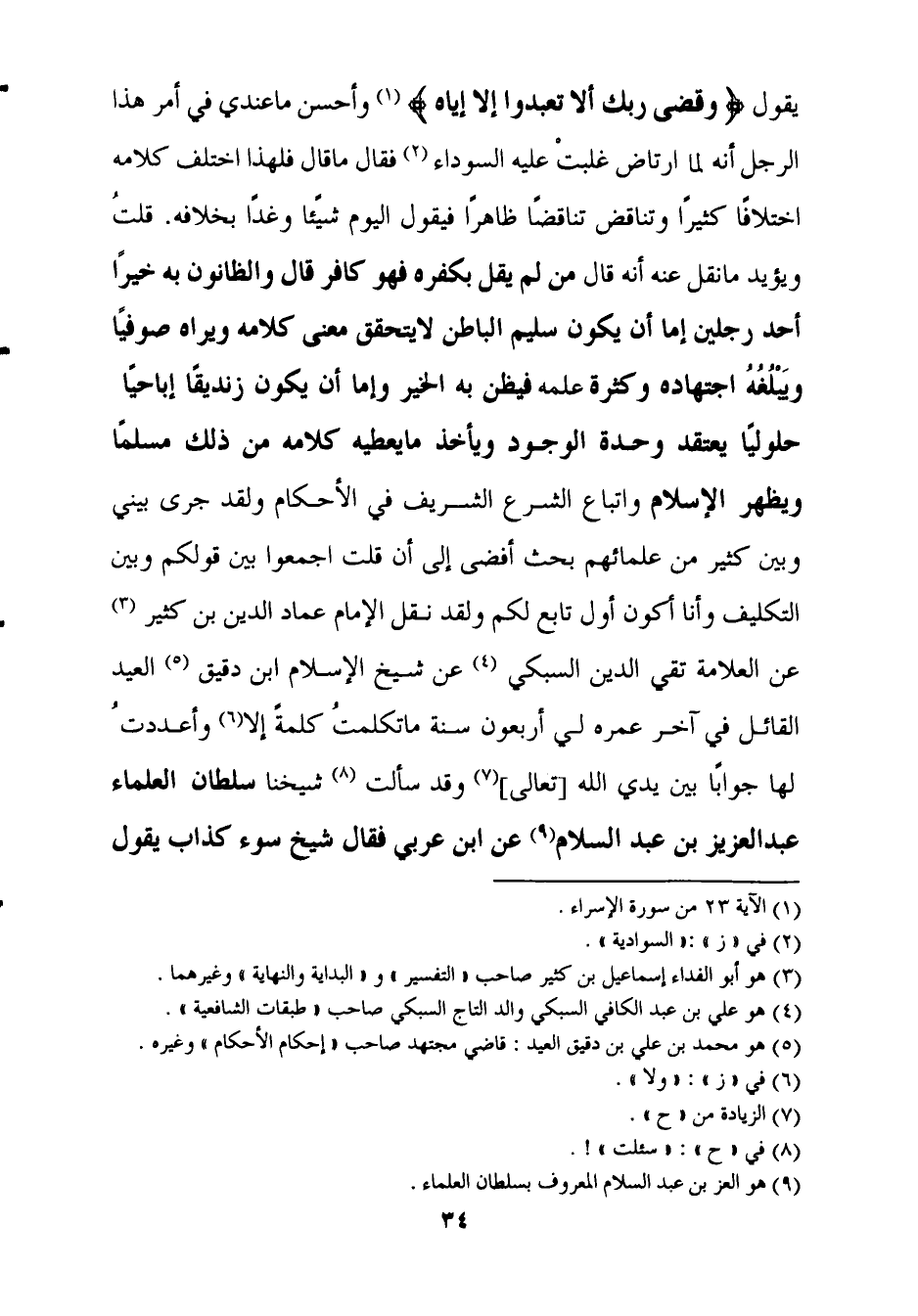 يَقُول {وَقضى رَبك أَلا تعبدوا إِلَّا إِيَّاه} وَأحسن مَا عِنْدِي فِي أَمر هَذَا الرجل أَنه لما ارتاض غلبت عَلَيْهِ السَّوْدَاء فَقَالَ مَا قَالَ فَلهَذَا اخْتلف كَلَامه اخْتِلَافا كثيرا وتناقض تناقضا ظَاهرا فَيَقُول الْيَوْم شَيْئا وَغدا بِخِلَافِهِ قلت وَيُؤَيّد مَا نقل عَنهُ أَنه قَالَ من لم يقل بِكُفْرِهِ فَهُوَ كَافِر قَالَ والظانون بِهِ خيرا أحد رجلَيْنِ إِمَّا أَن يكون سليم الْبَاطِن لَا يتَحَقَّق معنى كَلَامه وَيَرَاهُ صوفيا ويبلغه اجْتِهَاده وَكَثْرَة علمه فيظن بِهِ الْخَيْر وَإِمَّا أَن يكون زنديقا إباحيا حلوليا يعْتَقد وحدة الْوُجُود وَيَأْخُذ مَا يُعْطِيهِ كَلَامه من ذَلِك مُسلما وَيظْهر الْإِسْلَام وَاتِّبَاع الشَّرْع الشريف فِي الْأَحْكَام وَلَقَد جرى بيني وَبَين كثير من عُلَمَائهمْ بحث أفْضى إِلَى أَن قلت اجْمَعُوا بَين قَوْلكُم وَبَين التَّكْلِيف وَأَنا أكون أول تَابع لكم وَلَقَد نقل الإِمَام عماد الدّين بن كثير عَن الْعَلامَة تَقِيّ الدّين السُّبْكِيّ عَن شيخ الْإِسْلَام ابْن دَقِيق الْعِيد الْقَائِل فِي آخر عمره لي أَرْبَعُونَ سنة مَا تَكَلَّمت كلمة إِلَّا وأعددت لَهَا جَوَابا بَين يَدي الله تَعَالَى وَقد سَأَلت شَيخنَا سُلْطَان الْعلمَاء عبد الْعَزِيز بن عبد السَّلَام عَن ابْن عَرَبِيّ فَقَالَ شيخ سوء كَذَّاب يَقُول